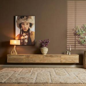 Modern groot zwevend tv meubel gemaakt van bruin massief mangohout en voorzien van drie deuren met hoogwaardige 'push-to-open' sluitsysteem. Het model kenmerkt zich door zijn strakke uitstraling en zijn greeploze deurtjes. Het meubel is afgewerkt met een naturel lak. Dit meubel is verkrijgbaar in de afmeting bxdxh: 240 x 35 x 30 cm Materialen: massief mangohout Kleur: naturel bruin