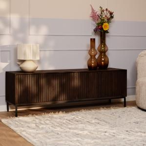 Modern TV-meubel van massief hout en voorzien van vier greeploze deuren. De deuren zijn voorzien van een verticaal lattenpatroon en is afgewerkt met een donkerbruine finish. Het metalen frame is afgewerkt met een zwarte lak. Sfeervol lowboard voor in een een modern of industrieel interieur. Combineer dit tv meubel met de andere meubelen uit deze serie! Het betreft een natuurproduct, oneffenheden, noesten in het hout kunnen voorkomen en behoren tot het karakter van deze woonserie! Dit tv meubel is verkrijgbaar in de afmeting...