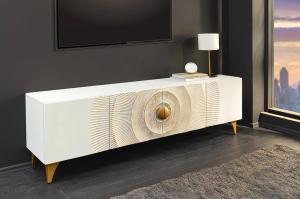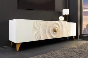Golden Glamour – Exclusief massief houten tv-meubel in wit en goud! Eyecatcher handgemaakt TV-meubel van massief mango hout gecombineerd met échte 3D houtfrezingen in een mooi zonnestralen patroon. Dit meubel is verkrijgbaar in de afmeting L x D x H: 180 x 40 x 55 cm Overige afmetingen BxDxH: Ruimte achter linker- & rechterdeur 42x36x34 cm Ruimte achter de deuren in het midden 88x36x34 cm Kleurcombinatie: Kastombouw wit Deuren wit met 3D houtfrezingen met gouden uitstraling Poten goudkleuri...