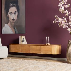 Modern zwevend greeploos tv meubel met rond vormgegeven hoeken en kabelopening in het bovenpaneel. Het meubel is gemaakt van massief mangohout en voorzien van vijf kleppen met hoogwaardig telescoop sluitsysteem. Bij dit meubel worden ook pootjes meegeleverd om er een staand model van te maken. Let op: wanneer u het meubel aan de muur bevestigd, is hij uitsluitend geschikt voor tv’s met een muurbevestiging. Het meubel is afgewerkt met een naturel lak Dit meubel is verkrijgbaar in de afmeting bxdxh: 280 x 35 x 30 cm ...