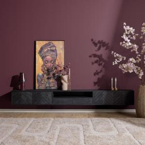 Strak modern zwevend tv-meubel zwart, gemaakt van massief mangohout. Het zwevende ontwerp schept een gevoel van ruimte in de woonkamer, waardoor een luchtige en open sfeer ontstaat. Dit tv-meubel is voorzien van twee open vakken en drie greeploze lades. Het bovenblad is voorzien van een kabelopening. Dit meubel is verkrijgbaar in de afmeting bxdxh: 280 x 35 x 30 cm Materialen: massief mangohout Kleur: zwart