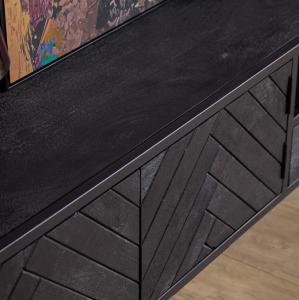 Modern TV meubel gecombineerd met deuren met visgraat motief. Sfeervol tv meubel in industriële woonsfeer. Combineer dit tv meubel met de andere meubelen uit deze serie! Dit tv meubel is verkrijgbaar in de afmeting B x D x H: 210 x 45 x 50 cm Kleur: zwart Materialen: Ombouw & deuren van mangohout gezandstraald Poten van metaal poedercoating