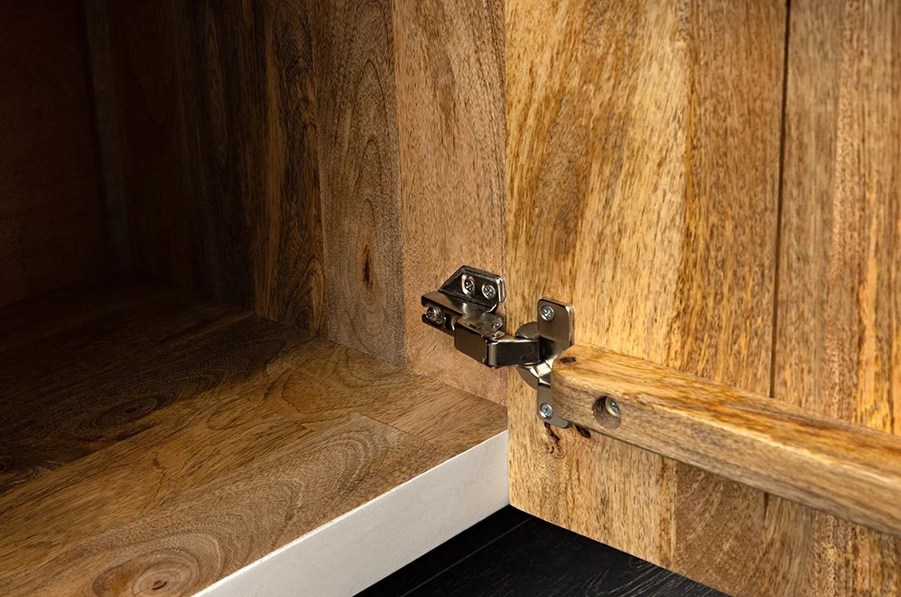Eyecatcher handgemaakt TV-meubel van massief mango hout gecombineerd met échte 3D houtfrezingen in een mooi zonnestralen patroon.