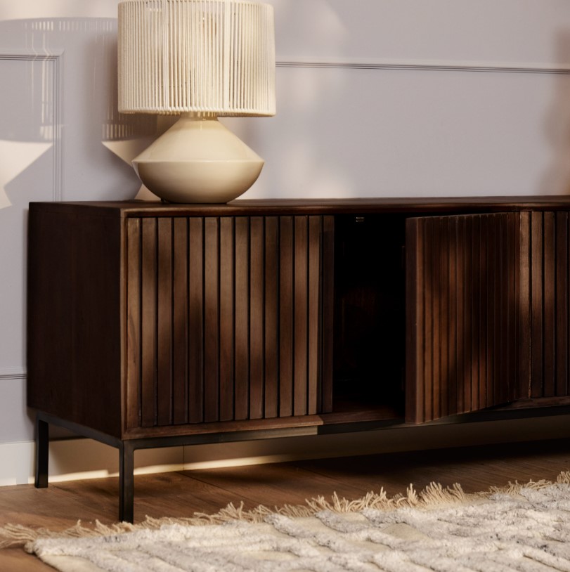 Modern TV-meubel van massief mangohout voorzien van vier deuren met push-to-open sluitsysteem. De deuren zijn voorzien van een verticaal lattenpatroon en is afgewerkt met een donkerbruine finish. Het metalen frame is afgewerkt met een zwarte lak. Sfeervol lowboard voor in een een modern of industrieel interieur.