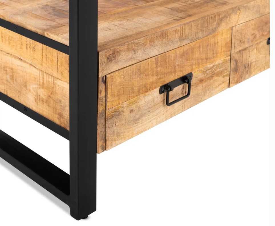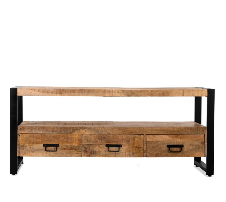 Stoer TV meubel van mango hout in industriële woonstijl.