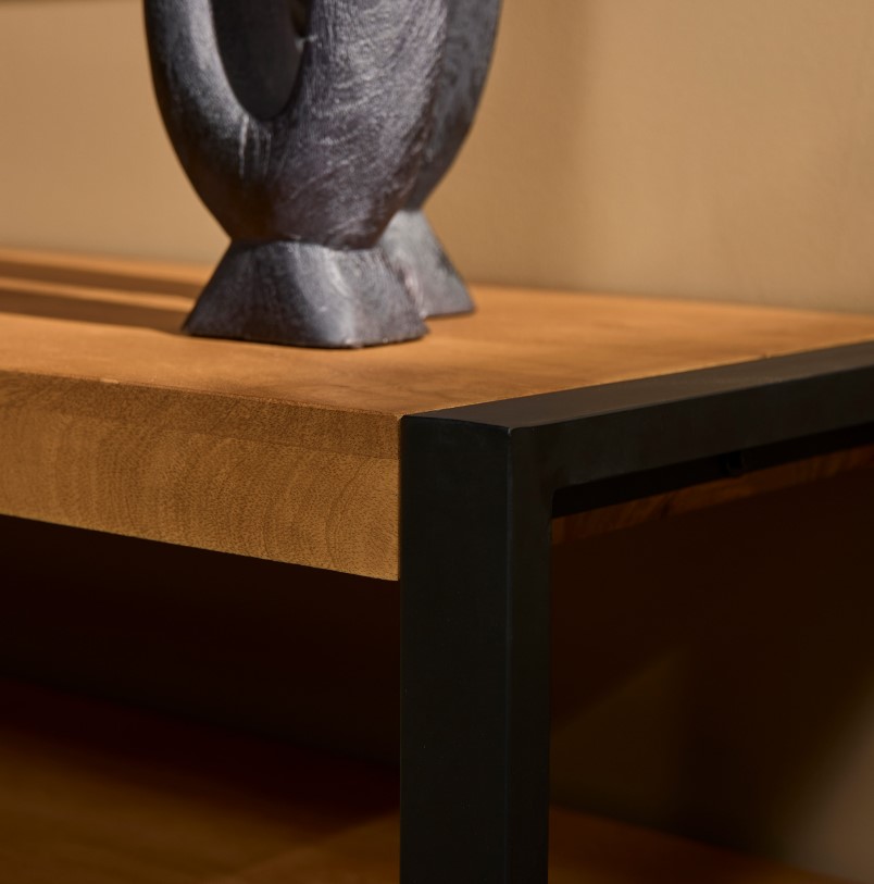Stoer TV meubel van mango hout in industriële woonstijl. Het mangohout heeft een gladde afwerking.
