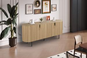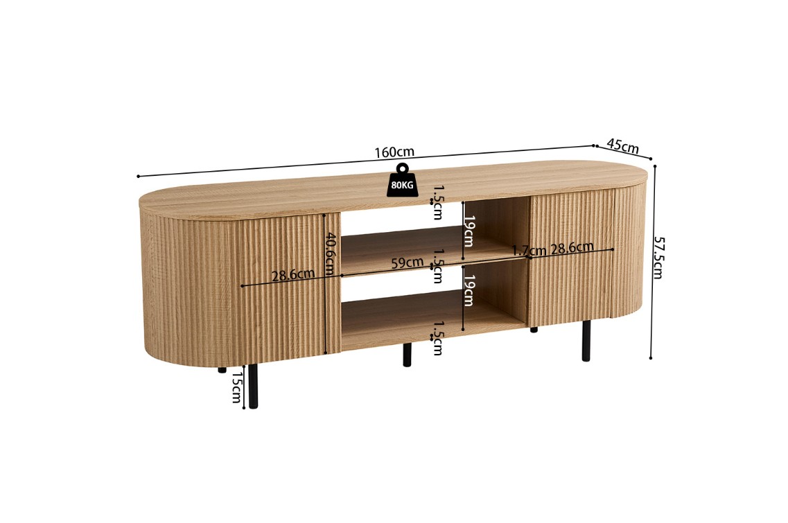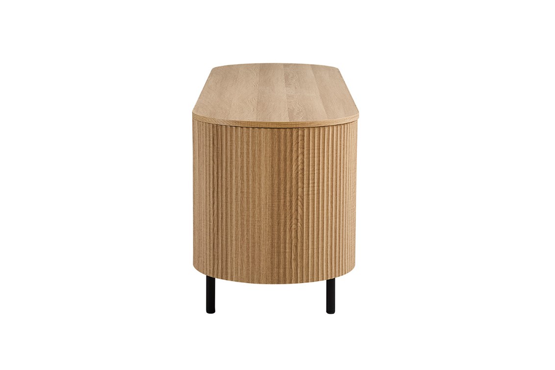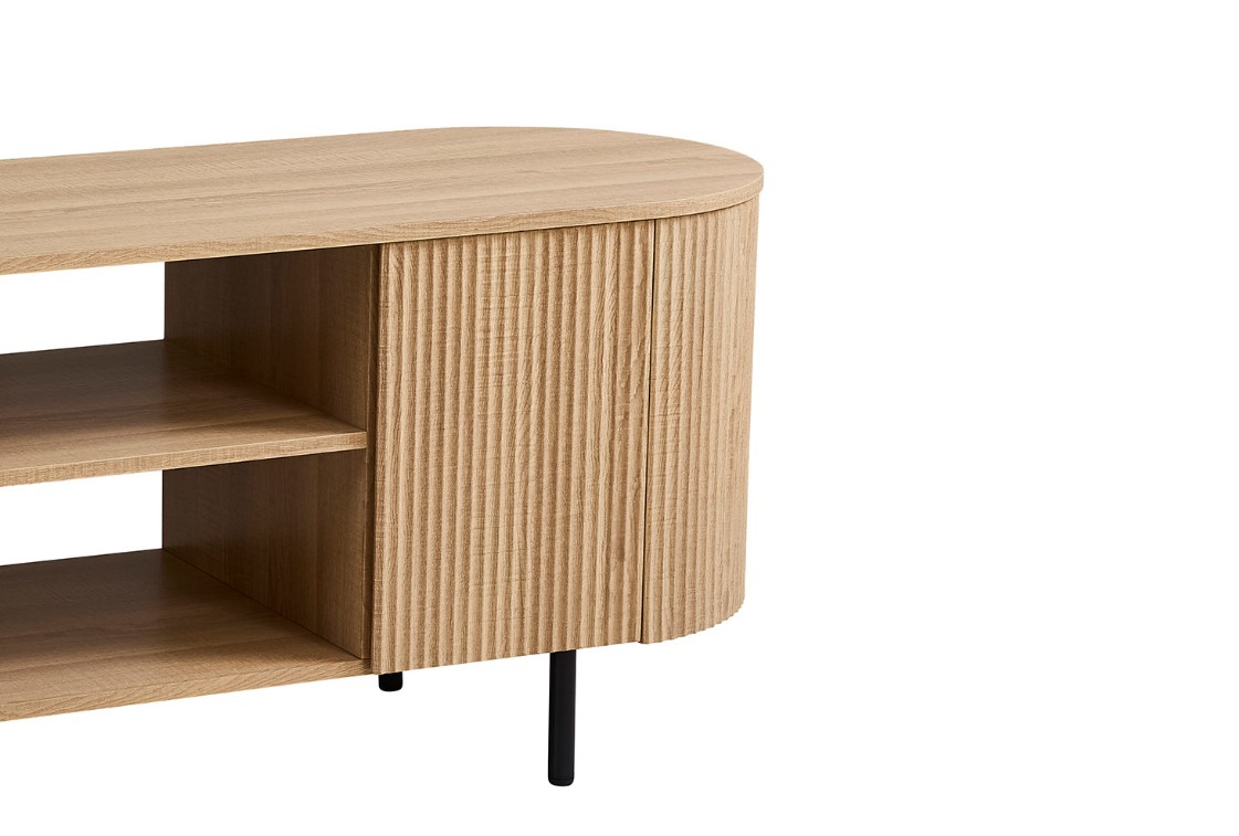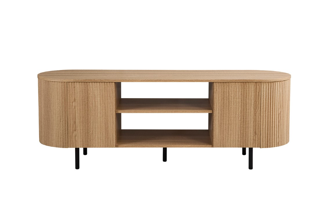 Modern ovaal vormgegeven TV-meubel met trendy ribbeldesign. Het meubel heeft twee greeploze deuren en twee open vakken voor audio apparatuur. Achter de deuren is er voldoende opbergruimte.