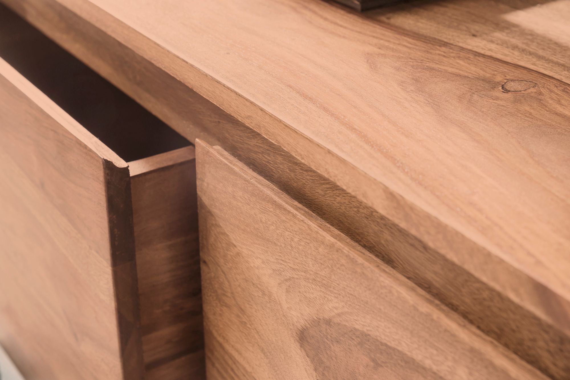 Handgemaakt gemonteerd TV-meubel van massief acaciahout. Dit tv meubel heeft één deur, twee open vakken en één lade.