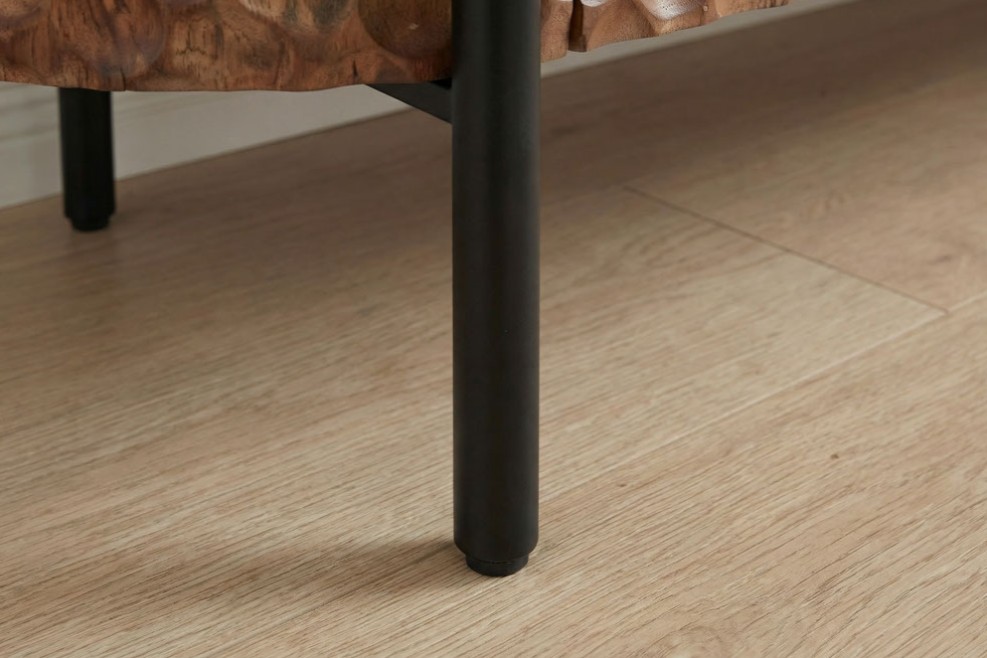TV-meubel in massief bruin mangohout gecombineerd met elegante zwarte metalen pootjes. Het meubel heeft een fraai design met ingefreesde 3D honingraatstructuur. Dit mooie patroon geeft dit meubel een unieke uitstraling.