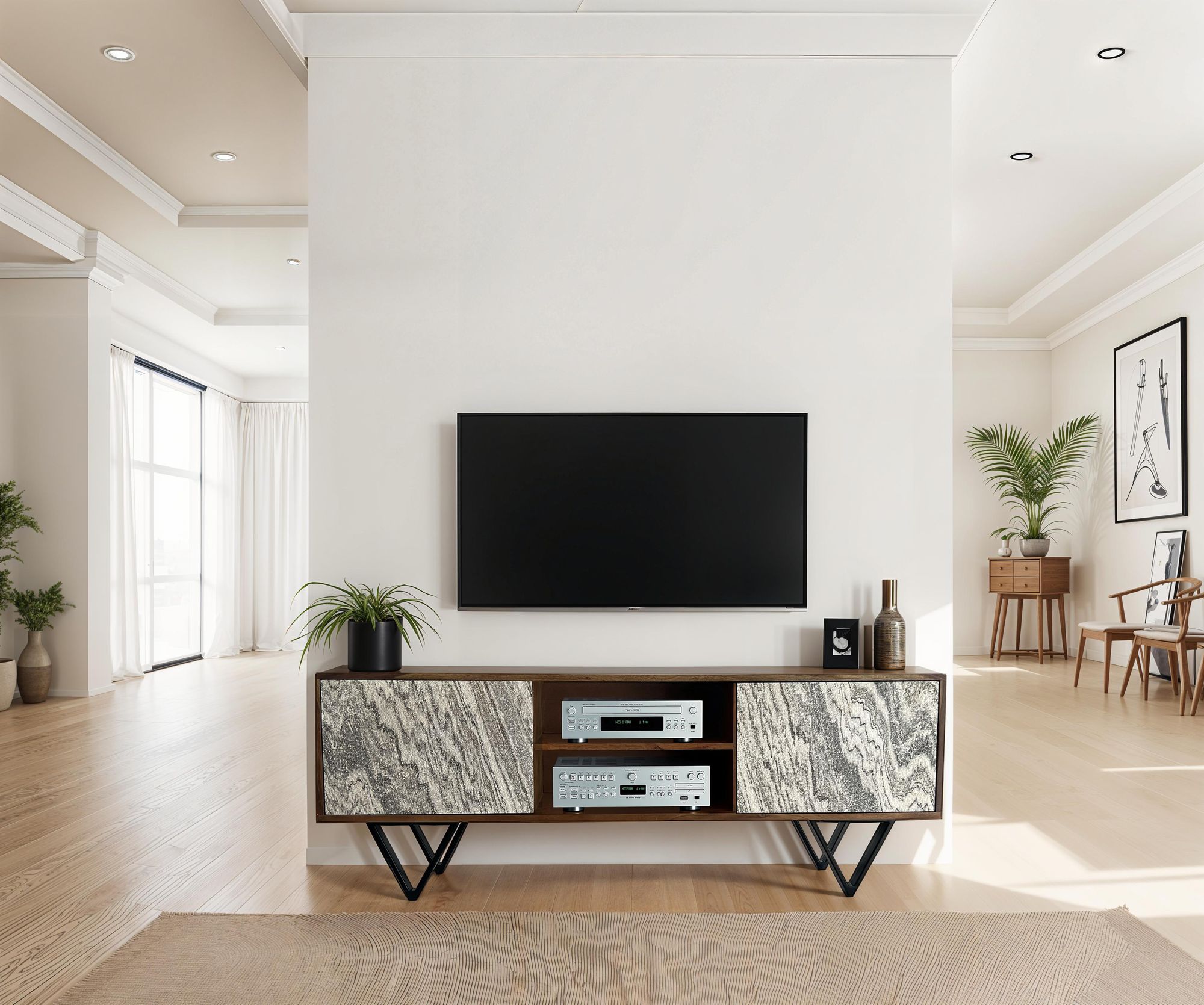 Modern en sfeervol TV-lowboard met twee deuren en open opbergvakken gecombineerd met V-vormige metalen pootjes. De deurfronten hebben een spannend en onregelmatig design door de 3D-steenlook uitstraling. Het meubel is met de handgemaakt en hierdoor absoluut uniek.