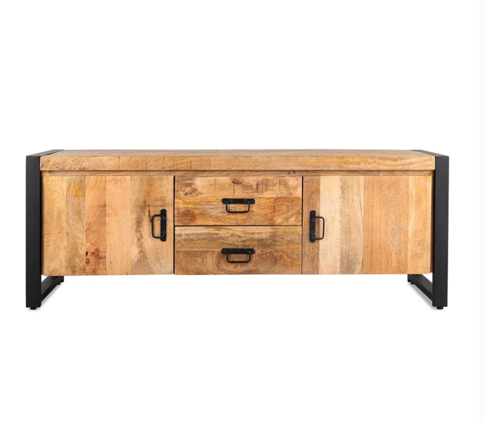 Industrieel modern mangohouten TV meubel voorzien van massief houten kastombouw, laden en deuren gecombineerd met zwarte metalen zijframes.