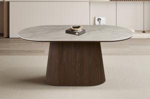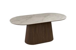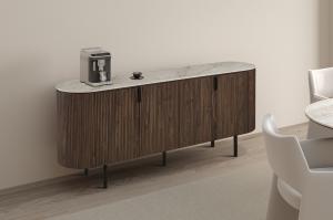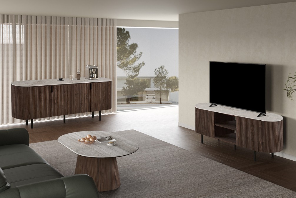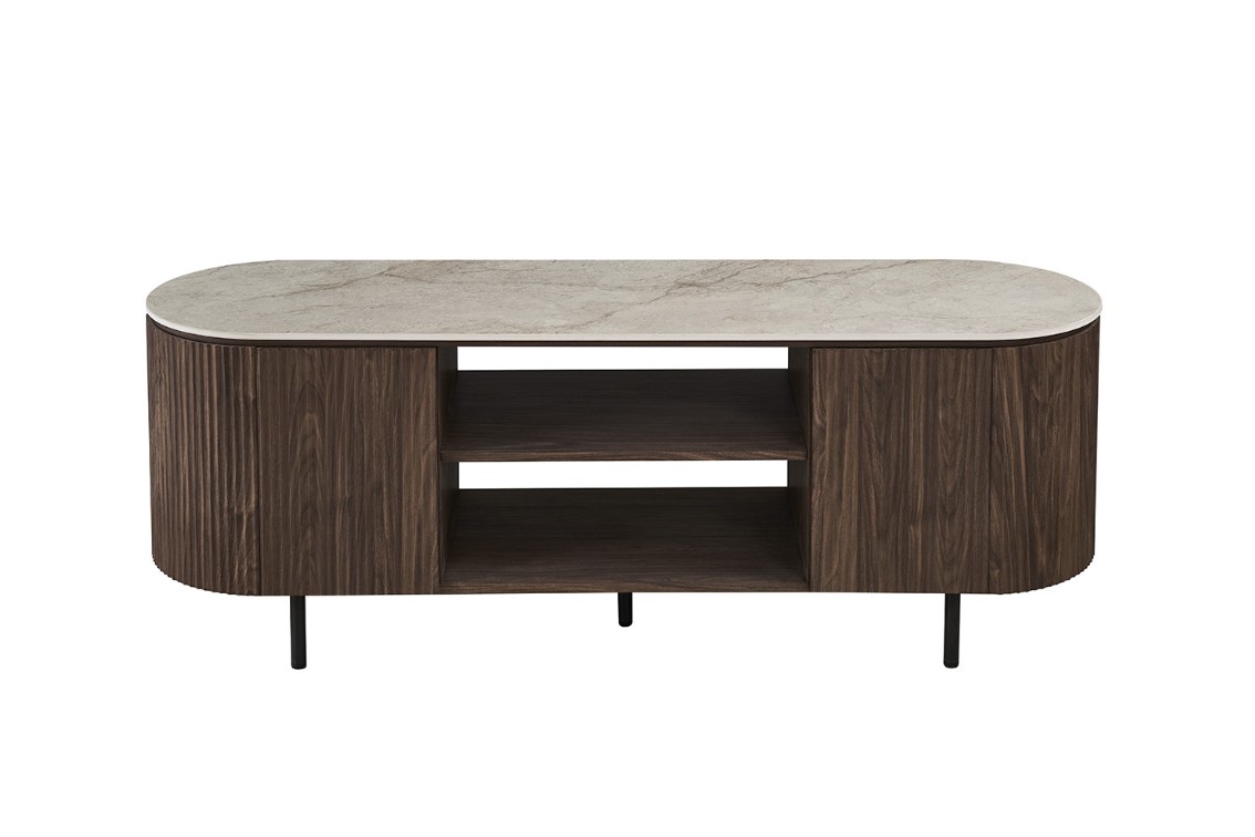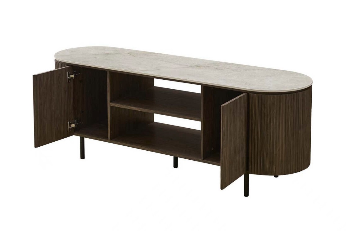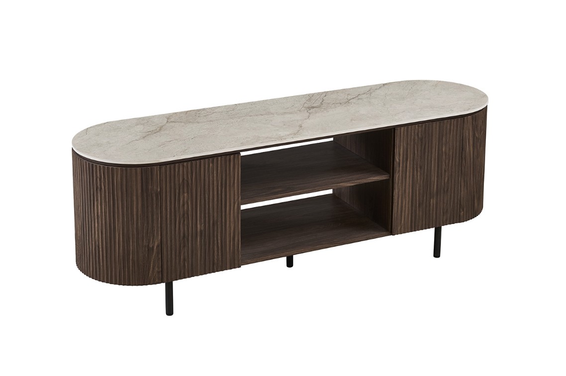 Modern ovaal vormgegeven TV-meubel met trendy ribbeldesign en beige bovenpaneel van keramiek/cintered stone. Het meubel heeft twee greeploze deuren en twee open vakken voor audio apparatuur. Achter de deuren is er voldoende opbergruimte.