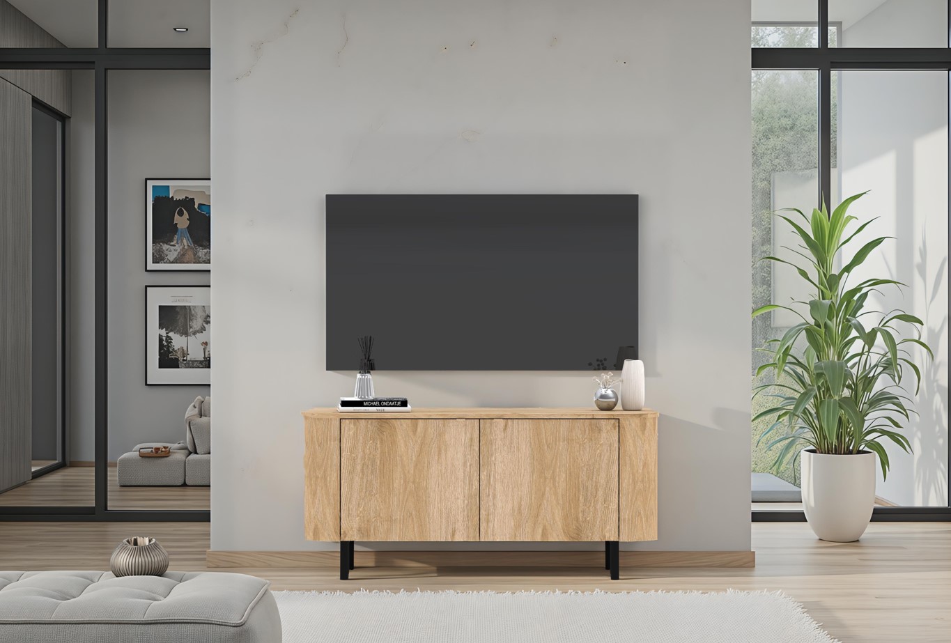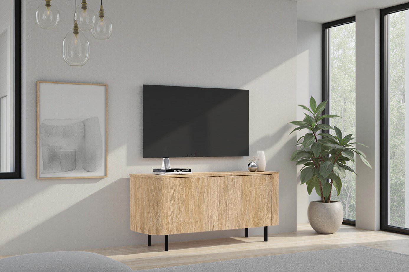 Modern TV-meubel in de kleur eiken cadiz gecombineerd met zwarte metalen poten. De harmonieus gebogen elementen en afgeronde voorzijden zorgen voor een stijlvolle, mooie uitstraling. De kast is voorzien van twee deuren die voorzien zijn van subtiele handgreepjes.