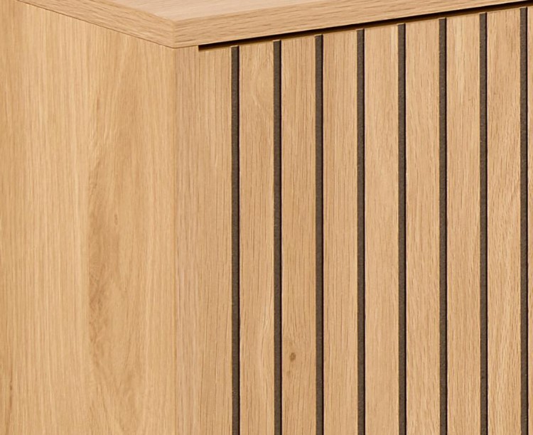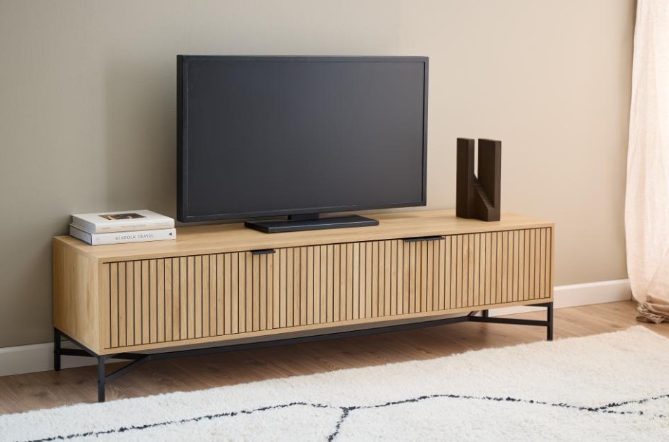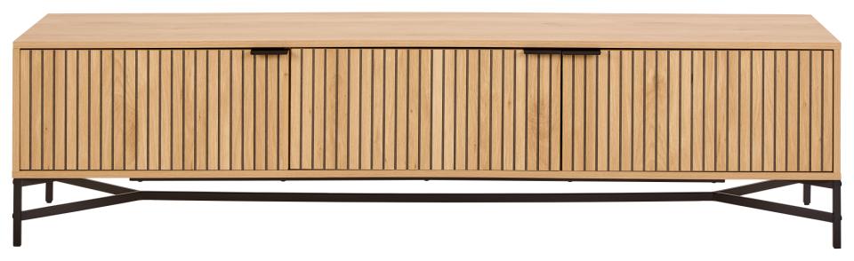 Modern TV-meubel in de kleur eiken met een trendy lamellenstructuur op de drie deuren. De deuren zijn voorzien van zwarte handgrepen. Het meubel wordt gecombineerd met zwart metalen onderstel.