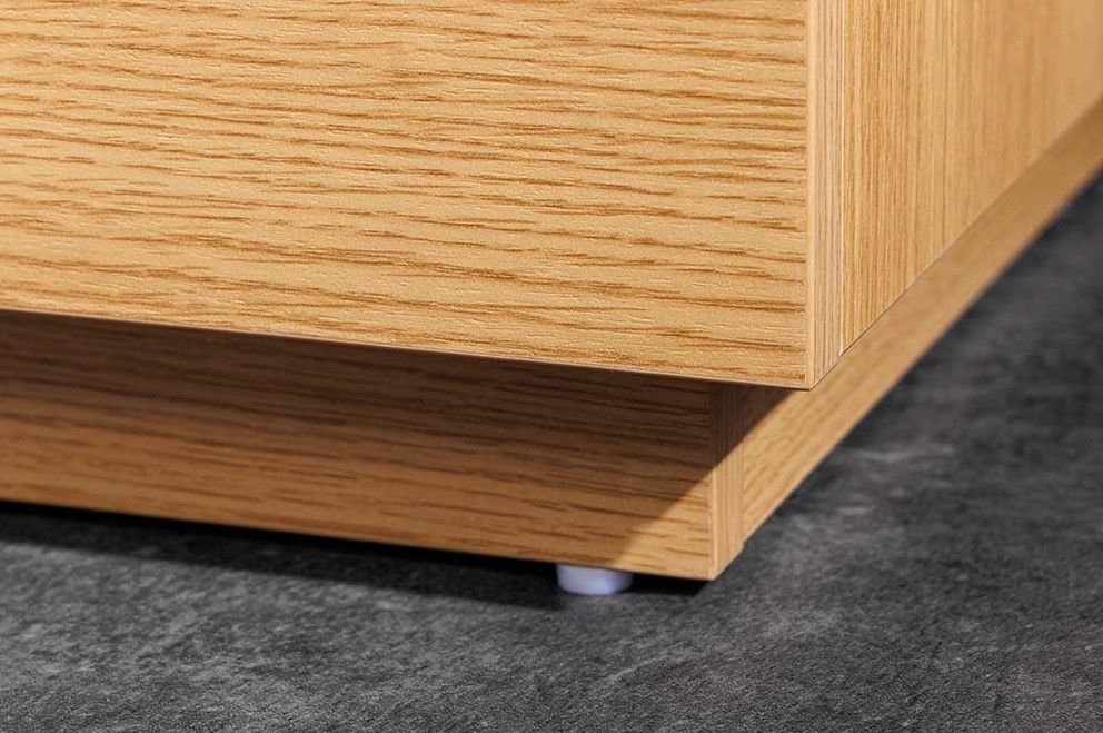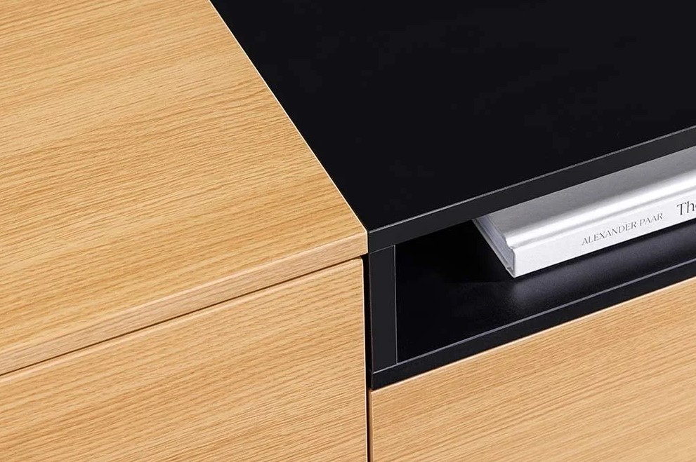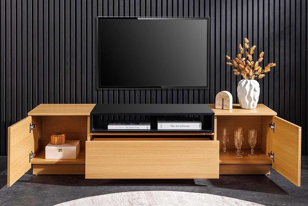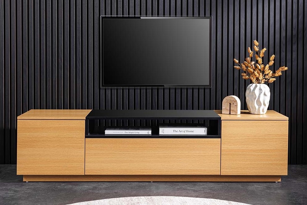 Dit tv-meubel met strakke lijnen geeft de woonomgeving zowel een moderne uitstraling als een mooi huiselijk karakter. De kastombouw in sfeervolle eiken kleur wordt stijlvol aangevuld met een zwart midden element, wat een harmonisch totaalbeeld creëert. Het stevige podium waarop het meubel staat geeft het meubel stabiliteit en ziet er tegelijkertijd modern uit. Of het nu in de woonkamer is of in de open woonruimte, dit tv-meubel brengt rust, structuur en stijl in uw huis. Achter de twee zijdeuren met een push-to-open-functie vind je voldoende ruimte voor je multimedia-apparaten, dvd's of alledaagse gebruiksvoorwerpen. Het open vak in het midden is perfect voor audio apparatuur of decoratieve accessoires, terwijl de lade eronder extra opbergruimte biedt.