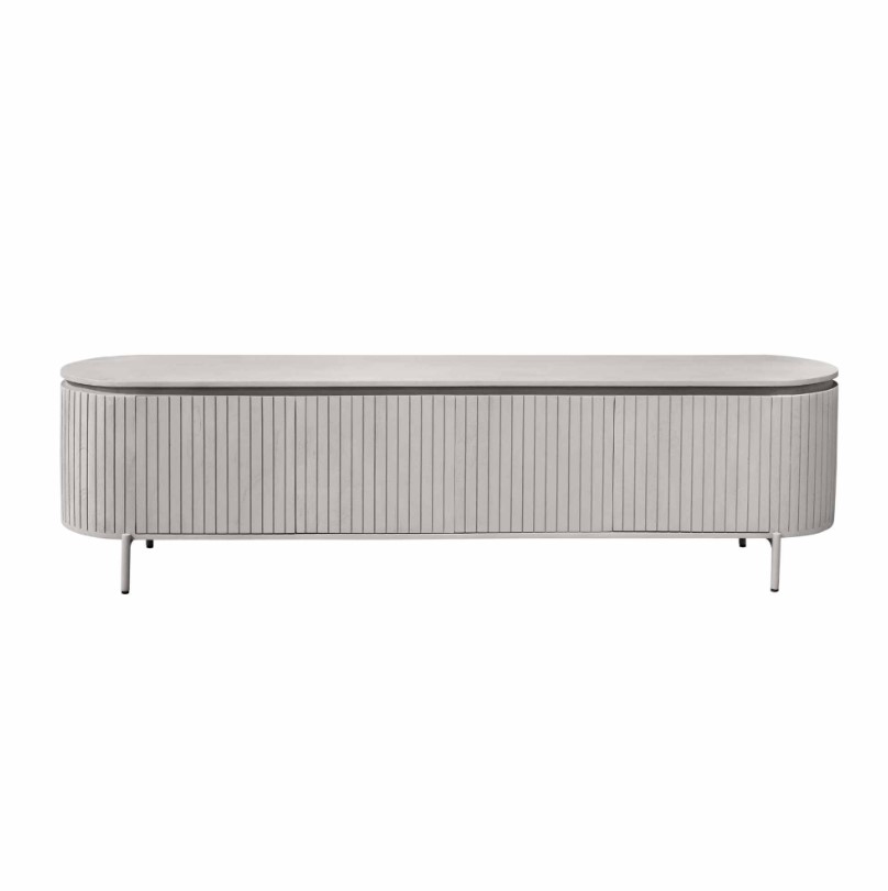Modern design tv meubel compleet van massief mangohout gecombineerd met metalen pootjes. Het meubel is voorzien van een verticaal lattenpatroon op de deuren en de zijkanten. Het meubel biedt veel opbergruimte voor electronica en andere persoonlijke items.