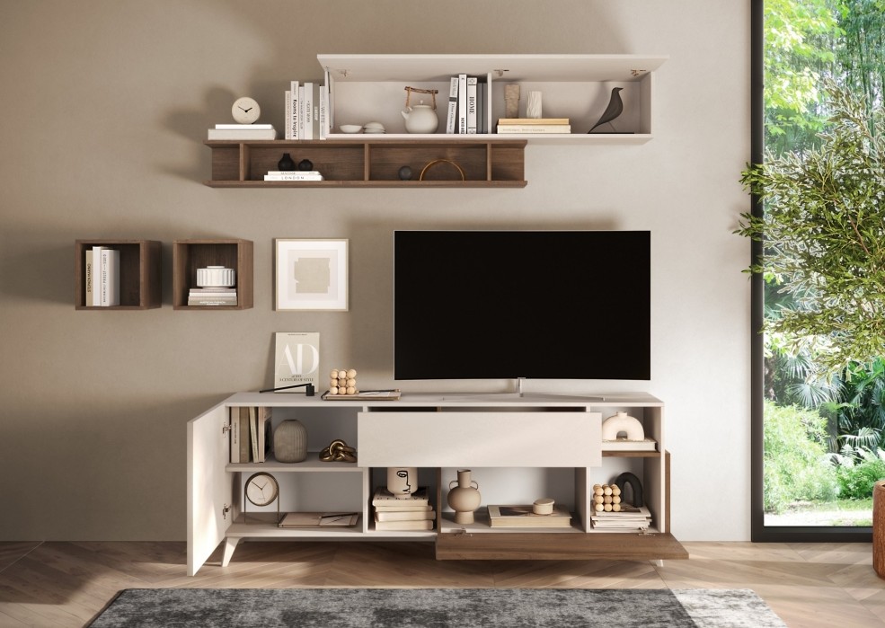 Het meubel beschikt over veel opbergruimte met een draaideur met daarachter een legplank, een handige lade, een klepdeur en twee open decoratieve vakken.