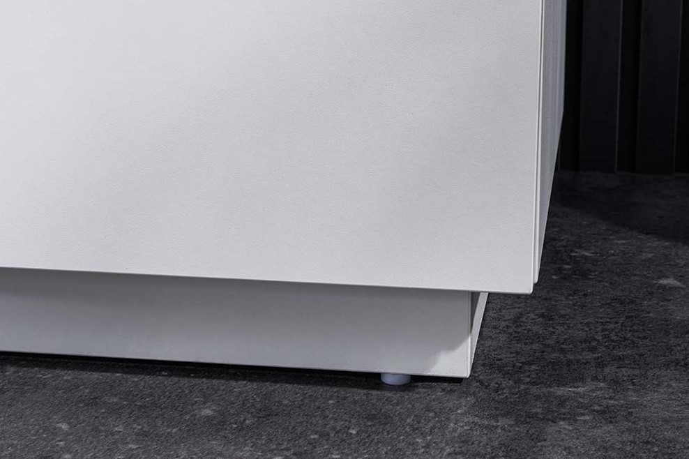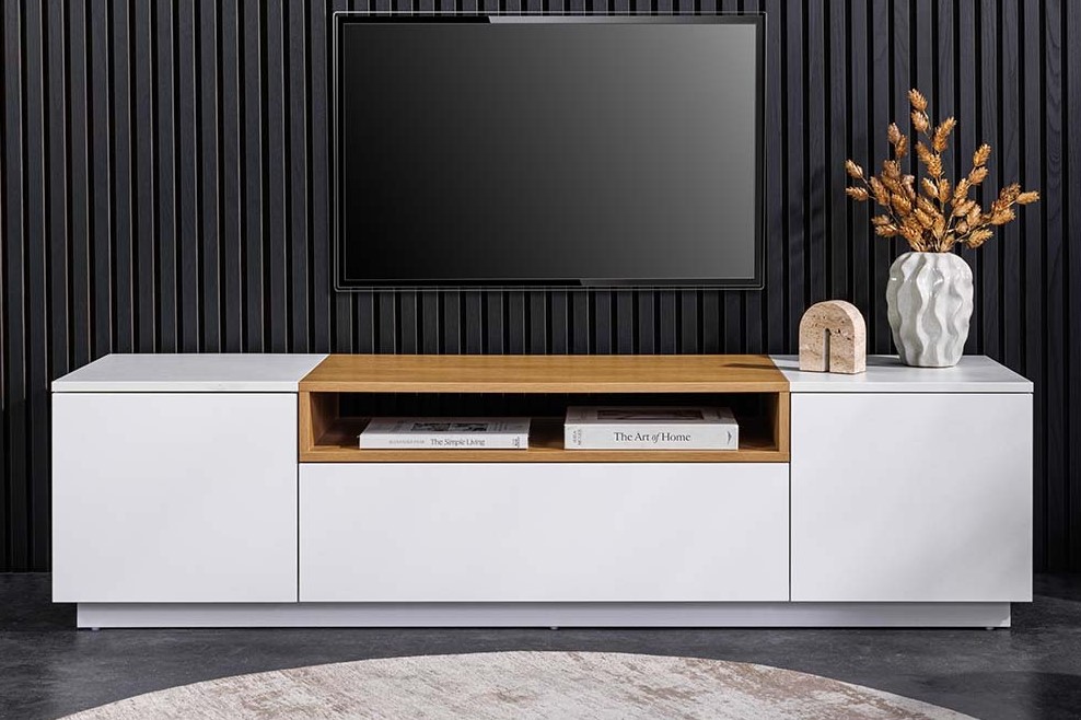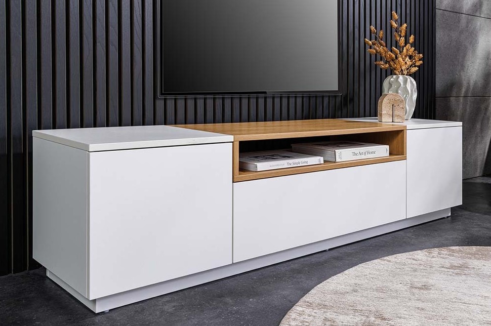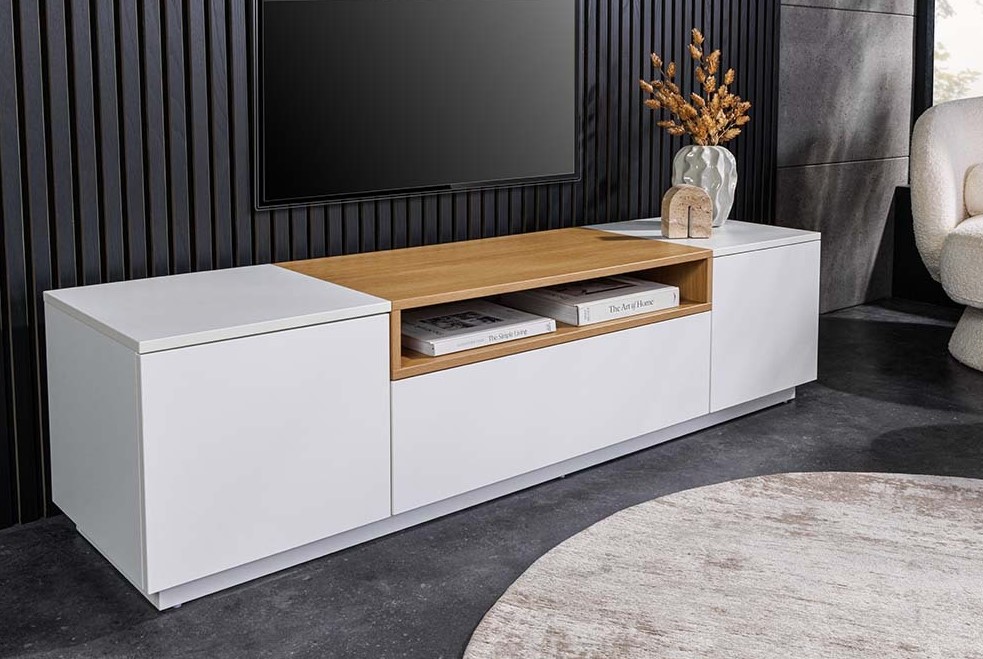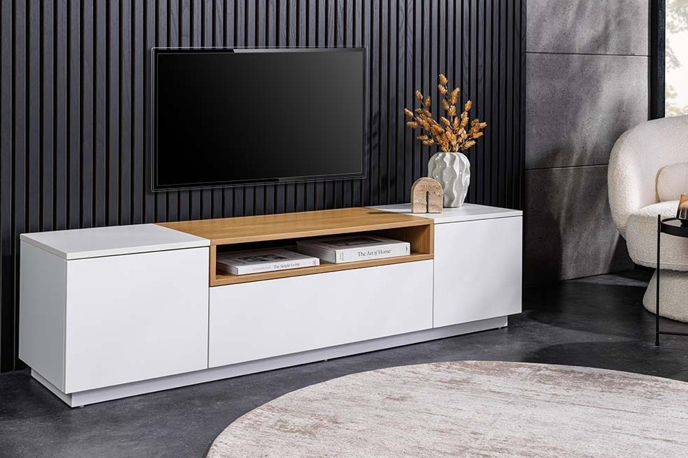 Dit tv-meubel met strakke lijnen geeft de woonomgeving zowel een moderne uitstraling als een mooi huiselijk karakter. De kastombouw in modern wit wordt stijlvol aangevuld met een midden element natuurlijke eiken kleur, wat een harmonisch totaalbeeld creëert. Het stabiele podium waarop het meubel staat geeft het meubel stabiliteit en ziet er tegelijkertijd licht en modern uit. Of het nu in de woonkamer is of in de open woonruimte, dit tv-meubel brengt rust, structuur en stijl in uw huis. Achter de twee zijdeuren met een push-to-open-functie vind je voldoende ruimte voor je multimedia-apparaten, dvd's of alledaagse gebruiksvoorwerpen. Het open vak in het midden is perfect voor audio apparatuur of decoratieve accessoires, terwijl de lade eronder extra opbergruimte biedt.