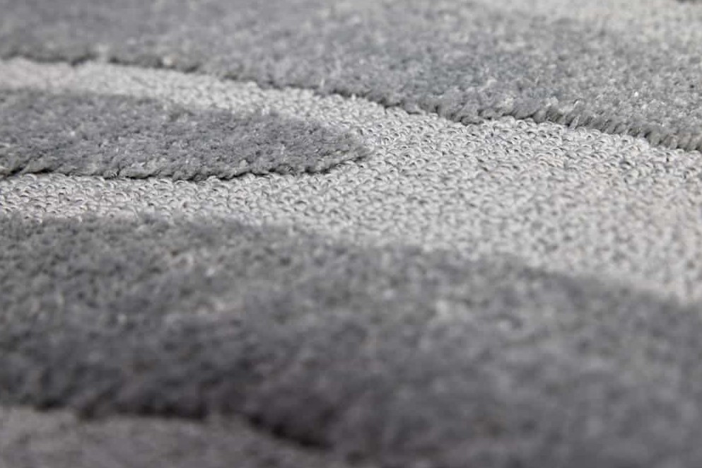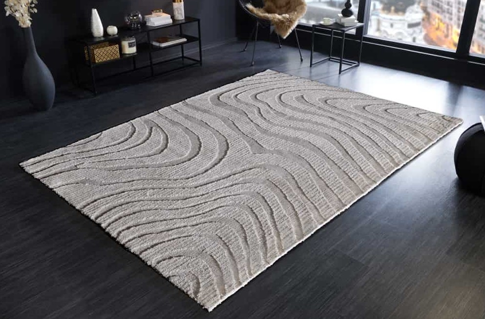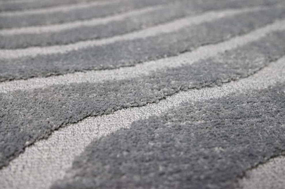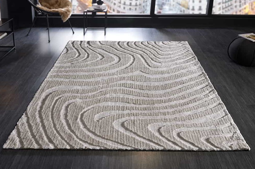 Modern groot vloerkleed in de kleur grijs met een mooi golvend patroon. Geschikt voor vloerverwarming.