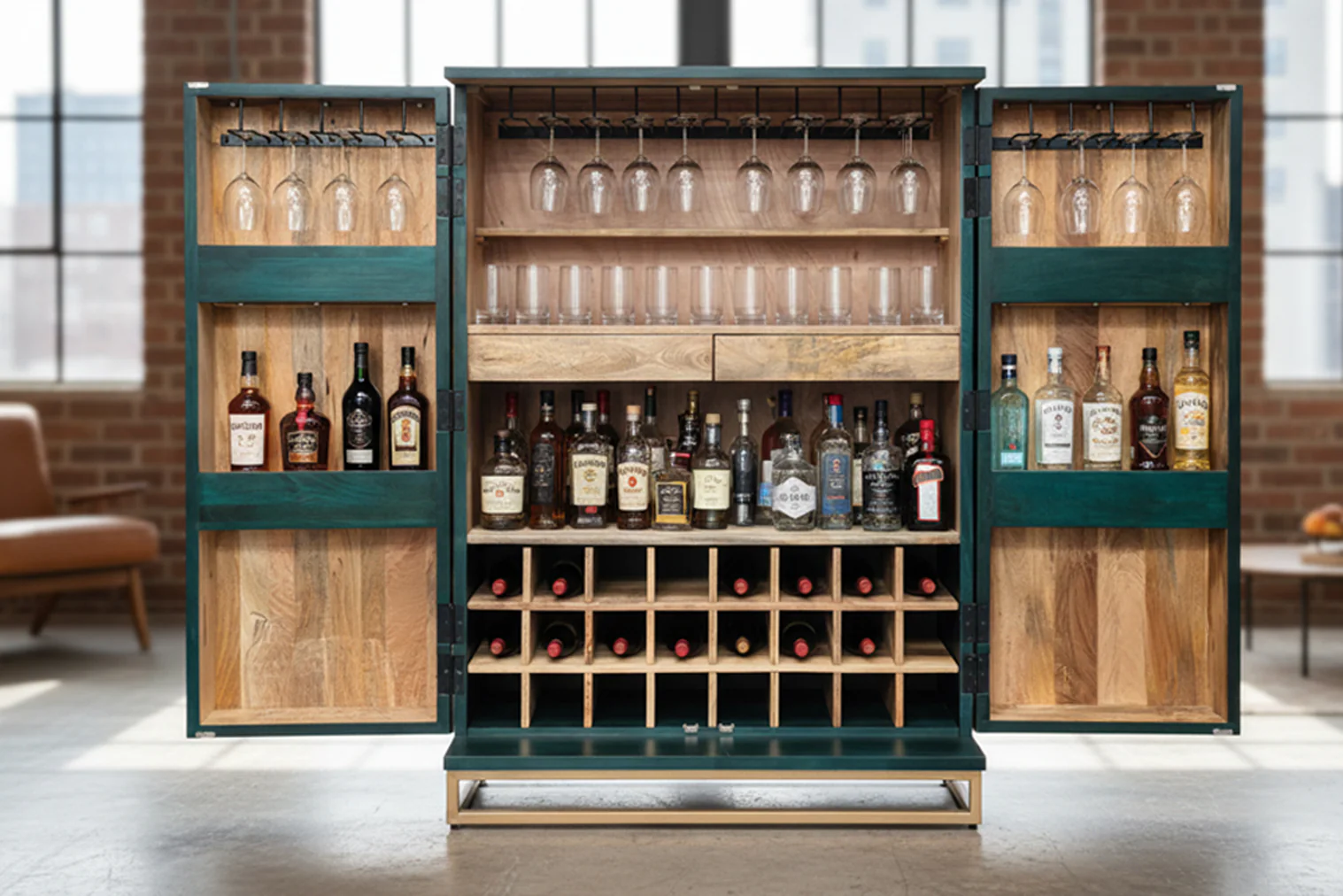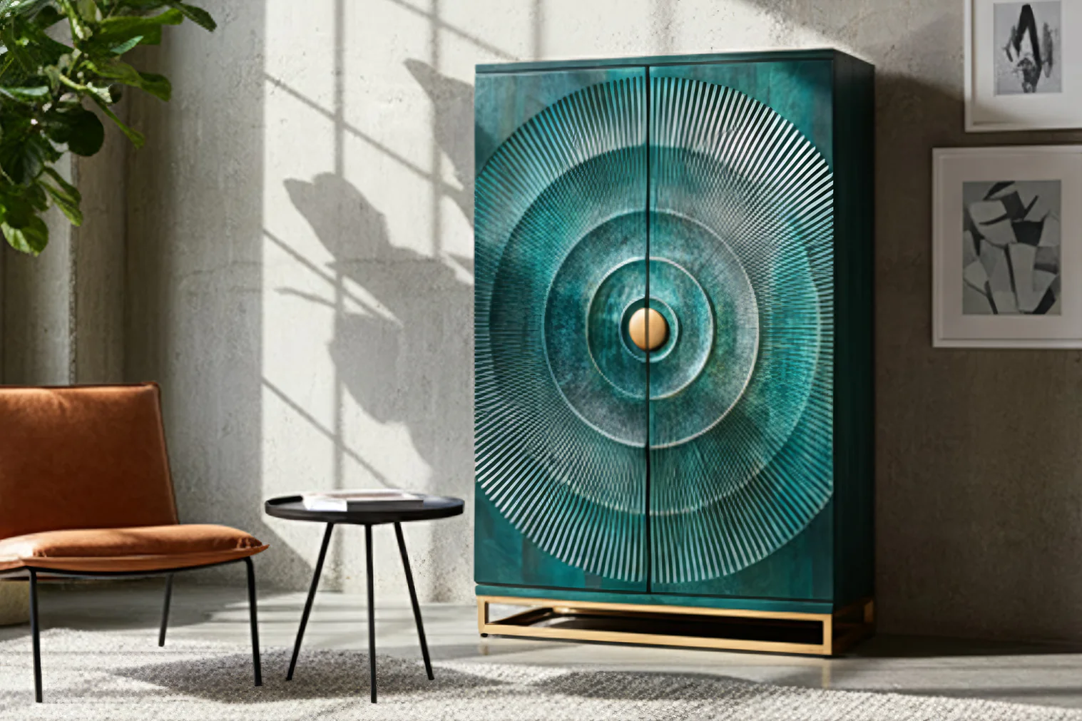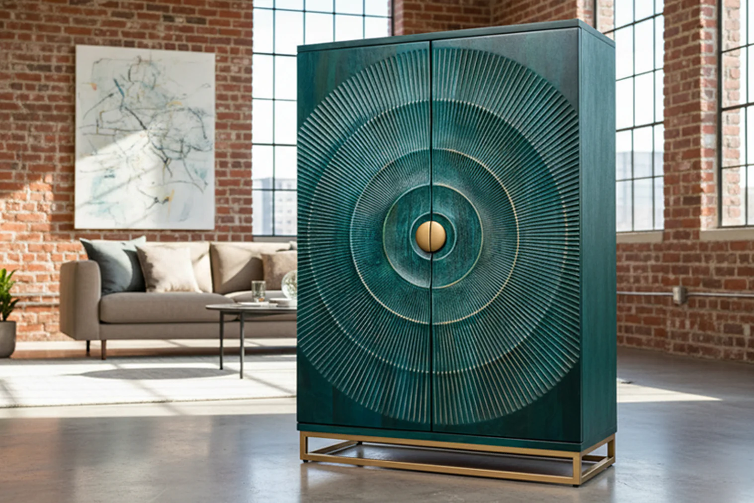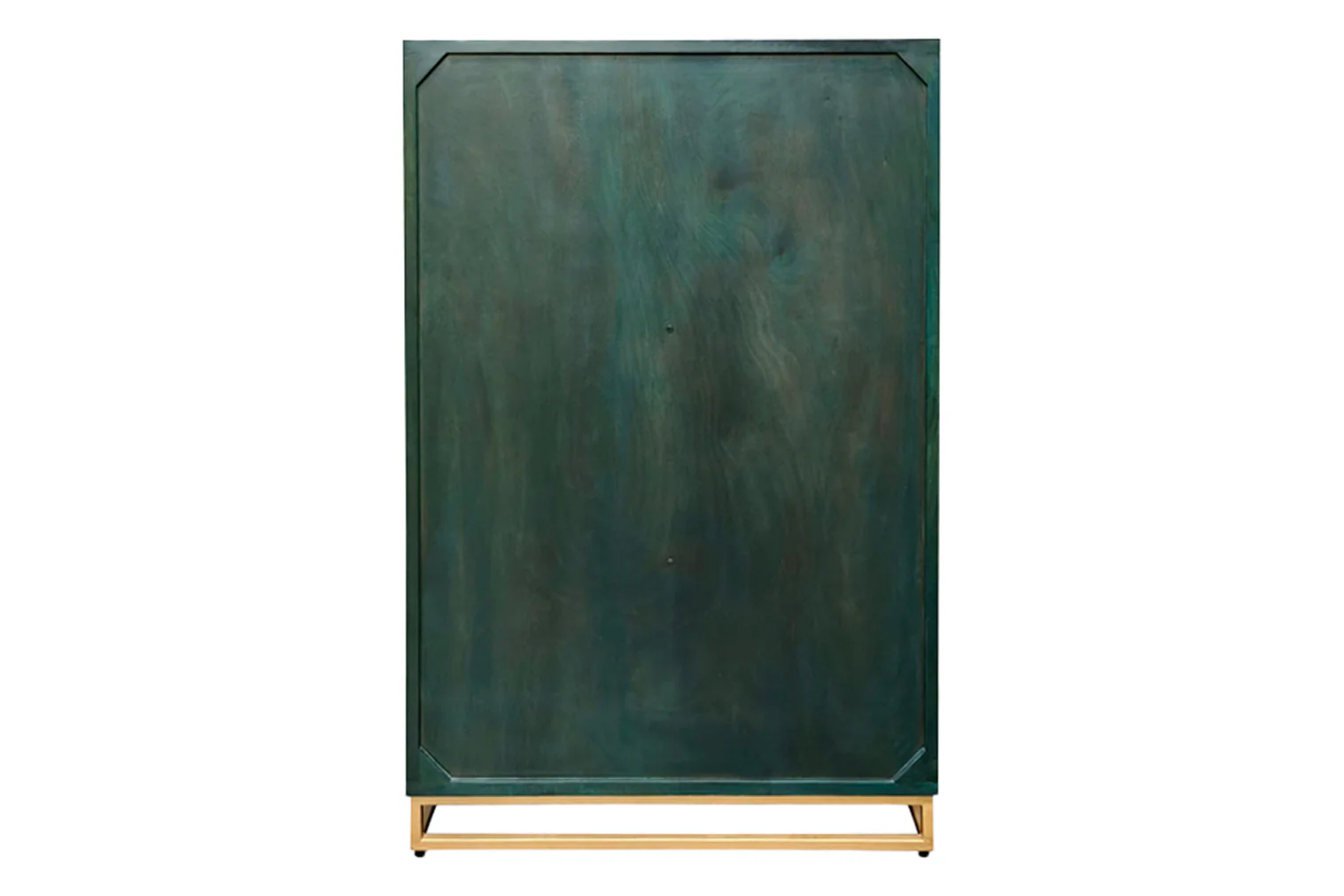 Deze barkast is echt iets bijzonders, want het buitengewone ontwerp trekt meteen ieders aandacht. De body is gemaakt van massief mangohout, dat een turquoise afwerking heeft gekregen en is voorzien van een handgemaakt 3D-patroon in de vorm van van zonnestralen. Zo ziet de hele voorkant van de bar er bijzonder levendig uit. Het gouden metalen frame pikt de extravagante uitstraling van de deuren op en zorgt voor een veilige stevige houvast op elk oppervlak.