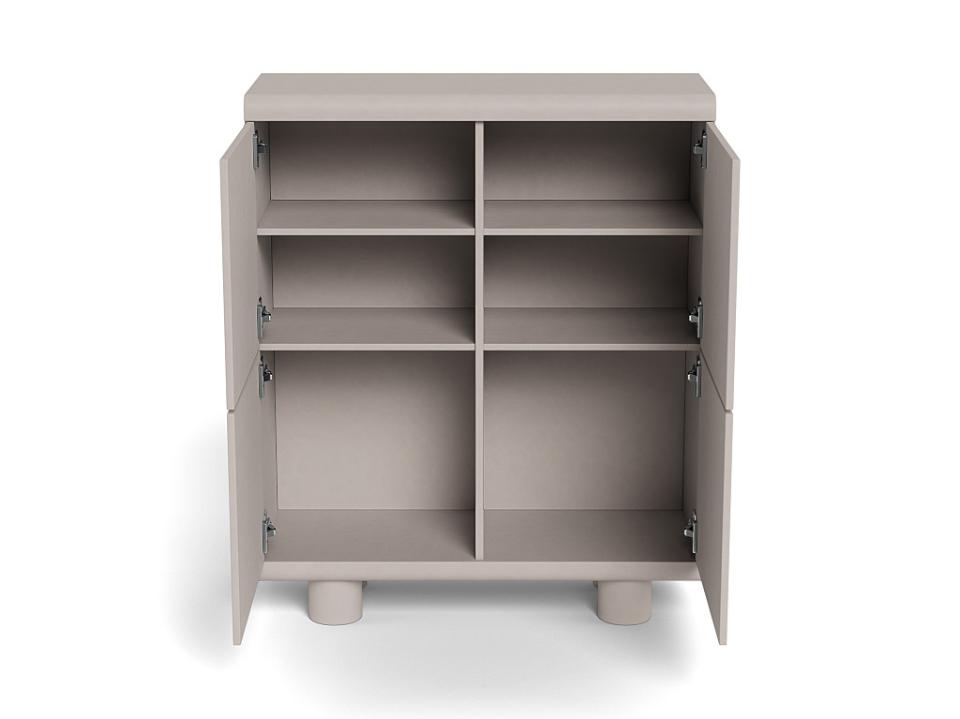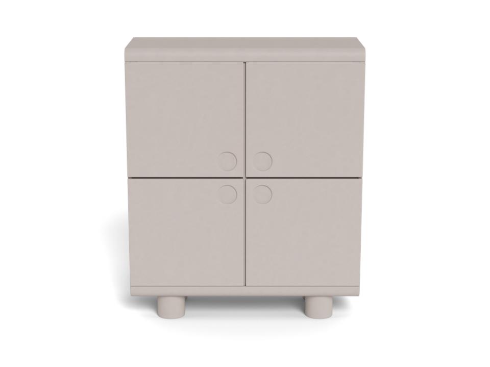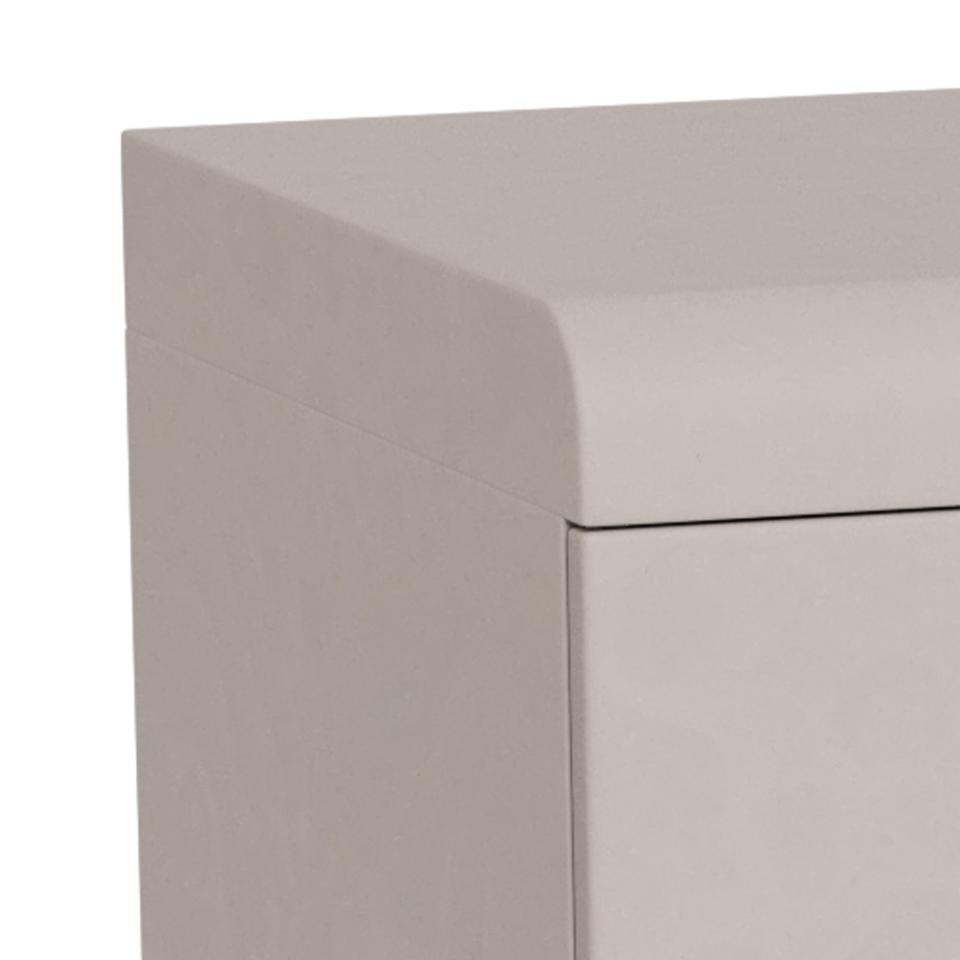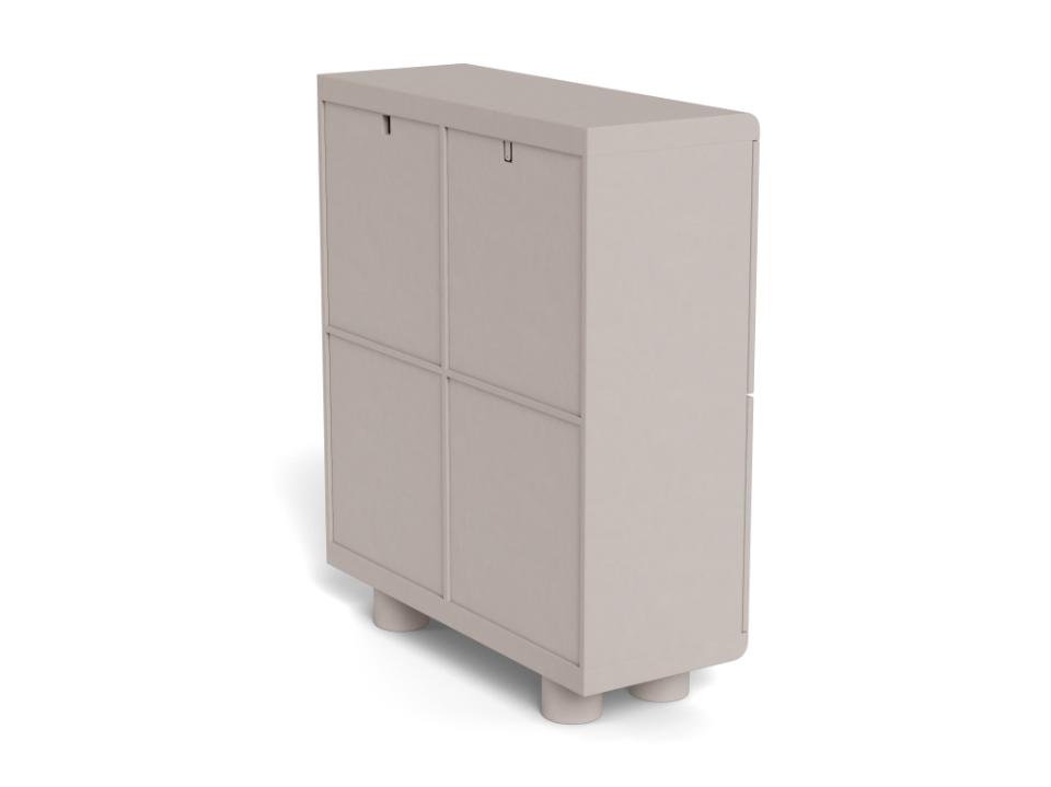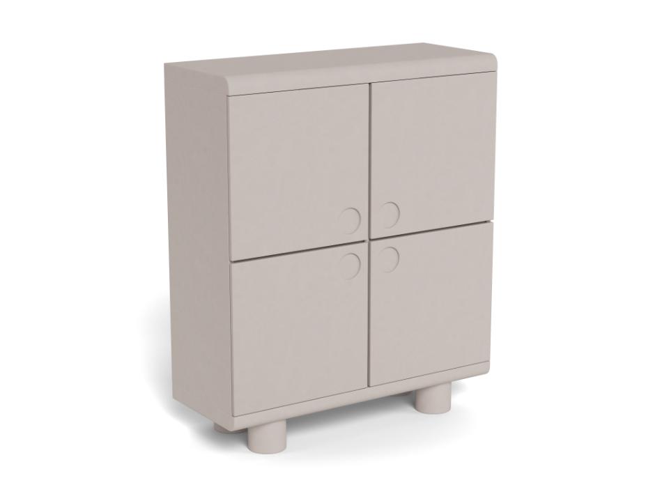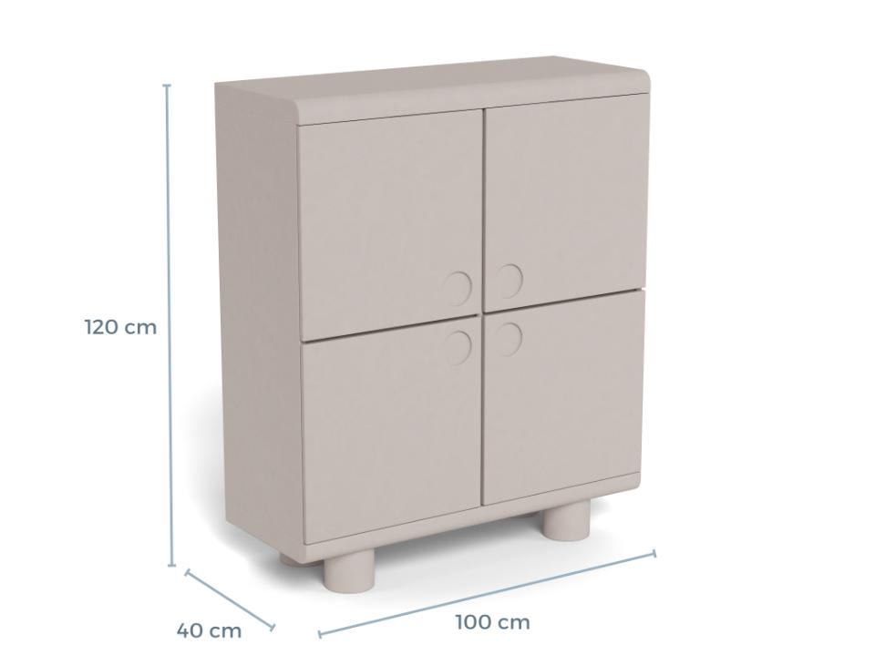 Moderne highboard wandkast voorzien van vier deuren met verzonken handgrepen en met achter de deuren 6 opbergvakken. De kast is compleet rondom grijs gelakt waardoor de kast indien gewenst ook in de vrije ruimte geplaatst kan worden. Voor extra stevigheid is het mogelijk om de kast aan de muur te bevestigen.