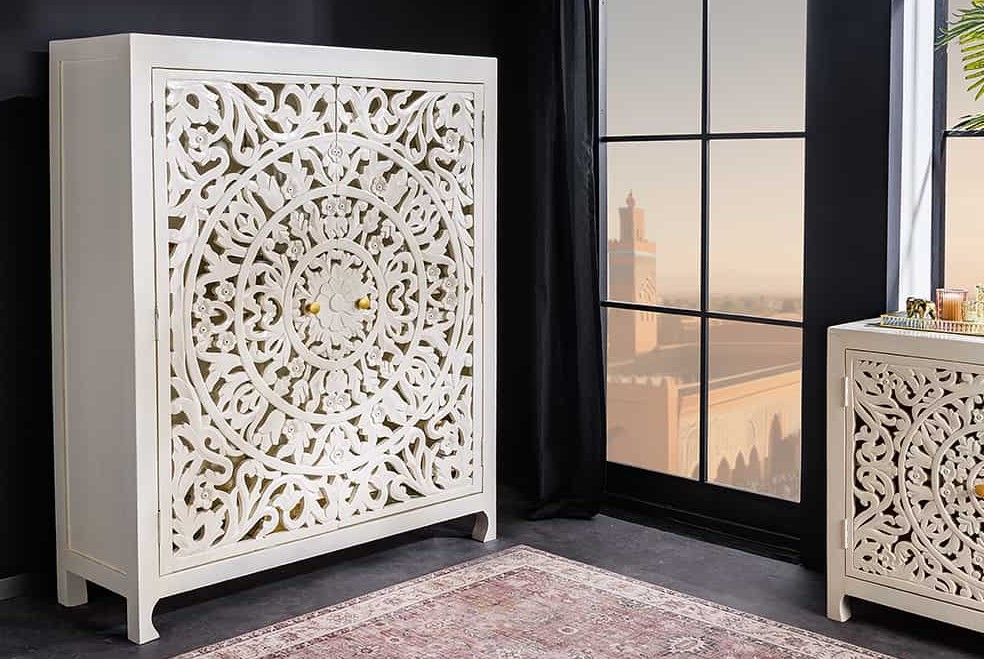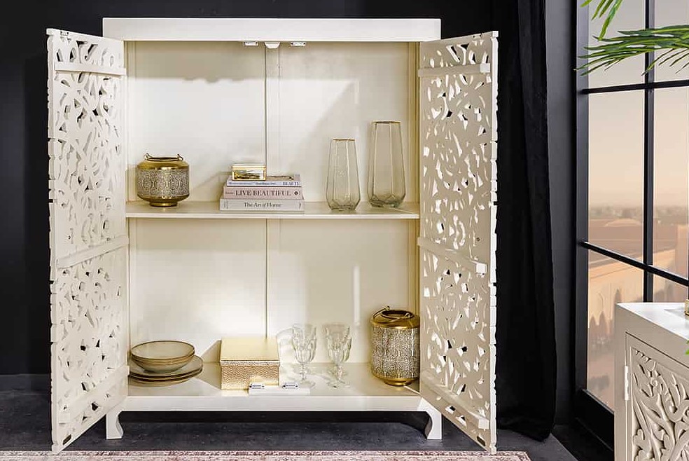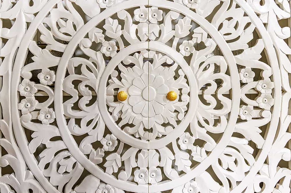Moderne handgemaakte wandkast wit mangohout met opengewerkte ornamentdeuren voorzien van goudkleurige handgrepen.