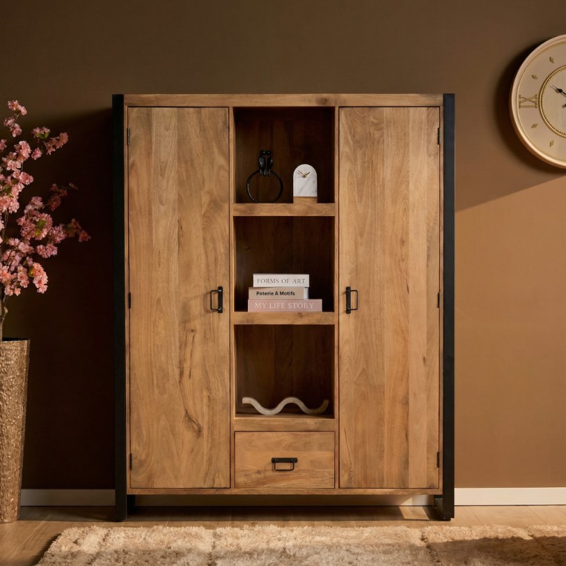Moderne industriële wandkast van massief mangohout gecombineerd met metalen frames. Het meubel is voorzien van twee deuren en één lade.