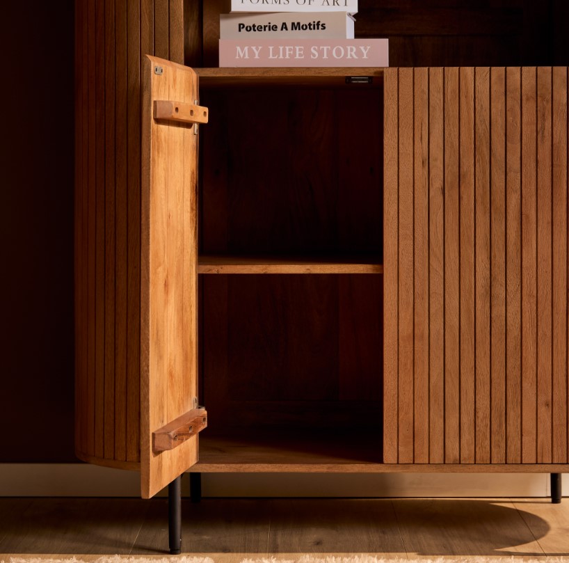 Stijlvolle en tijdloze wandkast gemaakt van massief mangohout in een naturel finish. Het verticale lattenpatroon geeft een moderne uitstraling. Deze wandkast is voorzien van twee deurtjes en drie open vakken, zodat er genoeg ruimte is voor zowel mooie accessoires als persoonlijke spullen. De wandkast is perfect te combineren met andere items uit dit woonprogramma.