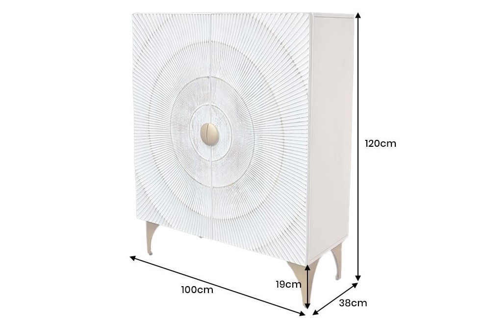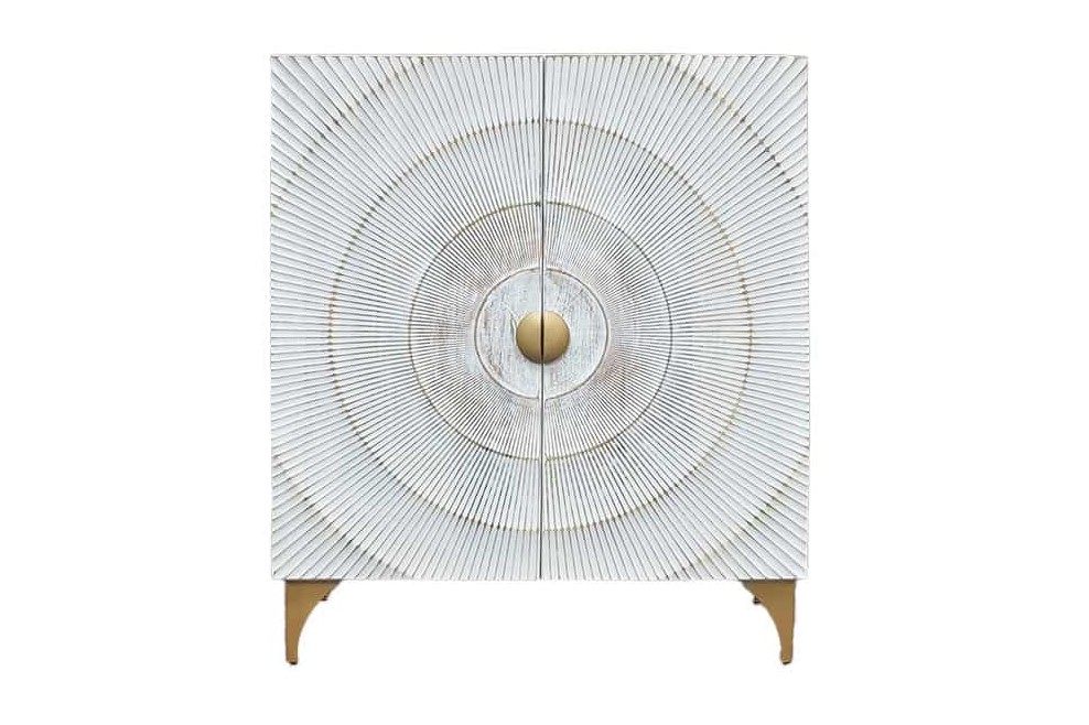 Eyecatcher handgemaakte opbergkast van massief mangohout gecombineerd met twee deuren met houtsnijwerk in de vorm van goudgele zonnestralen. De deuren zijn voorzien van soft-close sluitsysteem.