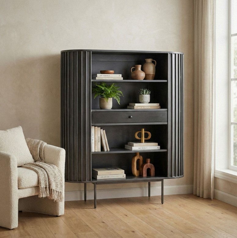 Moderne wandkast met ronde vormgeving gemaakt van massief mangohout. Het verticale lamellenpatroon geeft een moderne uitstraling. Deze wandkast is voorzien van één lade en en vier open opbergvakken, zodat er genoeg ruimte is voor bijvoorbeeld boeken, mooie accessoires als persoonlijke spullen.