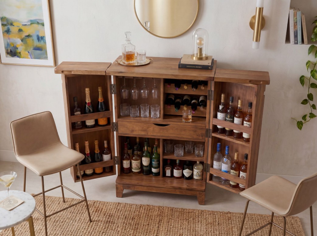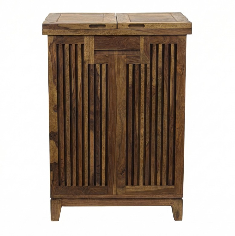 Wijnkast of barmeubel van massief sheesham hout met veel opbergruimte voor wijnflessen en wijnglazen. Tevens voorzien van lade. De deuren zijn voorzien van magneetsluitingen en hebben een moderne uitstraling door gebruik van verticale latten.