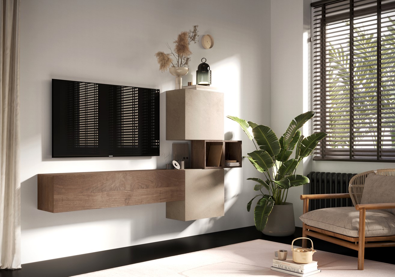 Modern minimalistisch wandmeubel met elementen in diverse trendy aardse kleuren? De greep loze meubels geven je woonkamer een strakke moderne uitstraling. Daarnaast is deze set erg praktisch, met een gesloten horizontale kast en gesloten kubuskasten. De kasten hebben één legplank achter de deur. Verder geven de open kubuselementen ruimte voor het presenteren van mooie decoratieve accessoires.