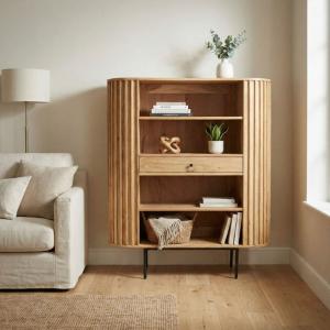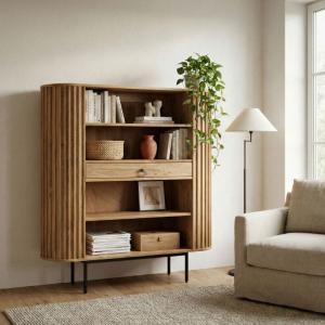 Moderne wandkast met ronde vormgeving gemaakt van massief acaciahout. Het verticale lamellenpatroon geeft een moderne uitstraling. Deze wandkast is voorzien van één lade en en vier open opbergvakken, zodat er genoeg ruimte is voor bijvoorbeeld boeken, mooie accessoires of persoonlijke spullen. Deze wandkast is verkrijgbaar in de afmeting BxDxH: 105 x 40 x 122 cm Kleur: Kastombouw & fronten naturel bruin met natuurlijke houtstructuren Poten zwart Materialen: Kastombouw & fronten van massief acaciahout Poten v...