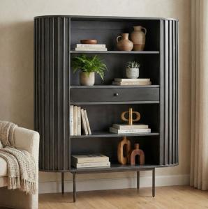 Moderne wandkast met ronde vormgeving gemaakt van massief mangohout. Het verticale lamellenpatroon geeft een moderne uitstraling. Deze wandkast is voorzien van één lade en en vier open opbergvakken, zodat er genoeg ruimte is voor bijvoorbeeld boeken, mooie accessoires als persoonlijke spullen. Deze wandkast is verkrijgbaar in de afmeting BxDxH: 105 x 40 x 122 cm Kleur: Zwart Materialen: Kastombouw & fronten van massief mangohout Poten van metaal