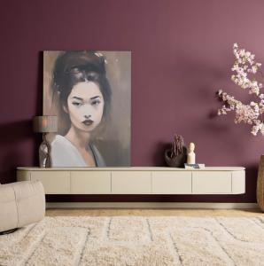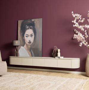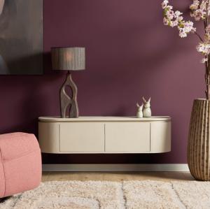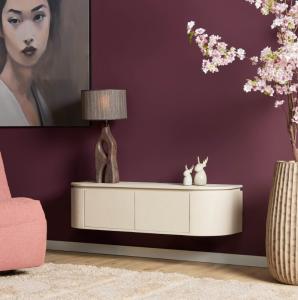 Modern greeploos zwevend tv-meubel met ronde vormgeving. De klep is extra voorzien van soft close telescoop sluitsysteem. Dit meubel is verkrijgbaar in de afmeting bxdxh: 180 x 33 x 37 cm Kleurcombinatie: Ombouw & fronten cashmere Materialen: Hoogwaardige melamine-gecoate panelen