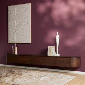 Strak modern zwevend tv-meubel donkerbruin, gemaakt van massief mangohout. Het zwevende ontwerp schept een gevoel van ruimte in de woonkamer, waardoor een luchtige en open sfeer ontstaat. Dit tv-meubel is voorzien van twee open vakken en drie greeploze lades. Het bovenblad is voorzien van een kabelopening. Dit meubel is verkrijgbaar in de afmeting bxdxh: 280 x 35 x 30 cm Materialen: massief mangohout Kleur: donkerbruin