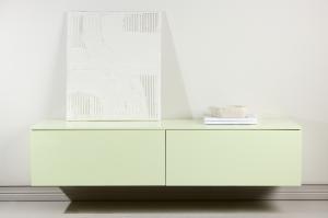 Strak modern hangend wandmeubel voorzien van twee laden. Maak je woonkamer extra aantrekkelijk met dit hangende wandmeubel. Een elegant en praktisch meubelstuk dat stijl combineert met functionaliteit. De glanzende lichtgroene afwerking voegt een frisse en trendy touch toe die de kamer naar een hoger niveau tilt. Het meubel biedt voldoende opbergruimte voor elektronica, afstandsbedieningen en andere benodigdheden en wordt aan de muur worden bevestigd om een luchtige sfeer te creëren en het schoonmaken makkelijker te maken. Dit meub...