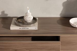 Modern stijlvol zwevend tv-meubel stripe in zand kleur, gemaakt van mangohout en gedetailleerd met een verticaal lattenpatroon op de klepdeuren. Het zwevende ontwerp schept een gevoel van ruimte in de woonkamer, waardoor een luchtige en open sfeer ontstaat. Dit zwevende tv-meubel stripe walnoot past perfect in ieder interieurstijl. Dankzij het hoogwaardige push-to-open systeem zijn handgrepen overbodig, wat resulteert in strakke greeploze deurtjes. Dit meubel is verkrijgbaar in de afmeting bxdxh: 160 x 35 x 30 cm Kleur: zan...