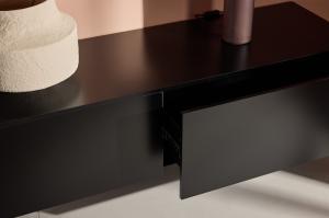 Modern groot zwevend tv meubel gemaakt van massief mangohout en voorzien van vier deuren met hoogwaardige 'push-to-open' sluitsysteem. Het model kenmerkt zich door zijn strakke uitstraling en zijn greeploze deurtjes. Het meubel is afgewerkt met een zwarte lak. Dit meubel is verkrijgbaar in de afmeting bxdxh: 240 x 35 x 30 cm Materialen: massief mangohout Kleur: zwart