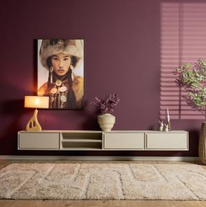 Stijlvol zwevend tv-meubel taupegrijs, gemaakt van massief mangohout. Het zwevende ontwerp schept een gevoel van ruimte in de woonkamer, waardoor een luchtige en open sfeer ontstaat. Dit tv-meubel is voorzien van twee open vakken en drie greeploze lades. Let op: dit meubel wordt aan de muur bevestigd en is uitsluitend geschikt voor tv’s met een muurbevestiging. Dit meubel is verkrijgbaar in de afmeting bxdxh: 280 x 35 x 30 cm Materialen: massief mangohout Kleur: taupegrijs