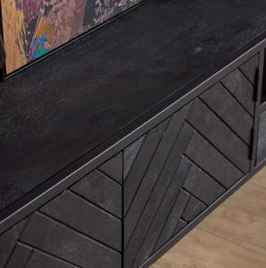 Modern hangend tv-dressoir van massief mangohout gecombineerd met deuren voorzien van frezingen in de vorm van een schorpioen. Het meubel is voorzien van kabelopening in het bovenblad. Afmetingen: Breedte 177 cm Diepte 38 cm Hoogte 58 cm Kleurcombinatie: Kastombouw zwart Deuren zwart Materialen: Kastombouw en deuren van massief mangohout