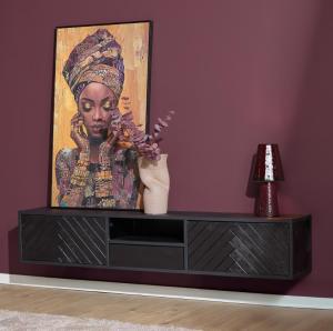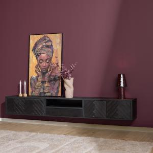 Stijlvol modern zwevend TV-meubel, een perfecte combinatie van elegantie en functionaliteit veelzijdig toe te passen in bijvoorbeeld een industrieel ingerichte en moderne woonkamers! Dit TV-meubel is gemaakt van gezandstraald massief mangohout en afgewerkt met een moderne zwarte lak. De deuren zijn voorzien van visgraatpatronen die het meubel een unieke en verfijnde look geeft, terwijl het open vak een praktische oplossing biedt om je audio apparatuur of decoratieve spullen overzichtelijk en stijlvol op te bergen en tentoon te stell...