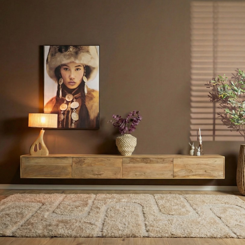 Modern groot zwevend  tv meubel gemaakt van bruin massief mangohout en voorzien van drie deuren met hoogwaardige 'push-to-open' sluitsysteem. Het model kenmerkt zich door zijn strakke uitstraling en zijn greeploze deurtjes. Het meubel is afgewerkt met een naturel lak.