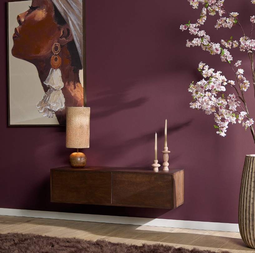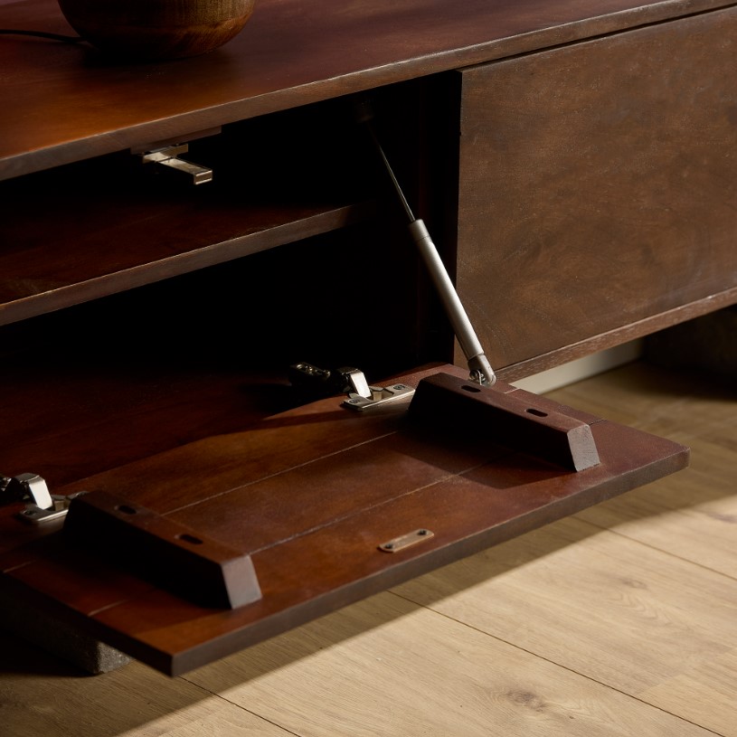 Stijlvol zwevend tv-meubel in warm donkerbruin, gemaakt van massief mangohout. Het zwevende ontwerp schept een gevoel van ruimte in de woonkamer, waardoor een luchtige en open sfeer ontstaat. Dit tv-meubel is voorzien van twee deuren met telescoopsluitingen.