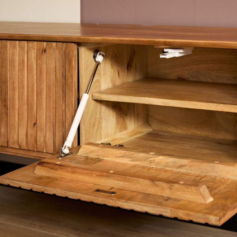 Modern stijlvol zwevend tv-meubel van massief mangohout in de kleur bruin naturel. Het meubel heeft een gedetailleerd verticaal lattenpatroon op de klepdeuren. Het zwevende ontwerp schept een gevoel van ruimte in de woonkamer, waardoor een luchtige en open sfeer ontstaat. Dit zwevende tv-meubel past perfect in ieder interieurstijl. Dankzij het hoogwaardige push-to-open systeem zijn handgrepen overbodig, wat resulteert in strakke greeploze deurtjes.