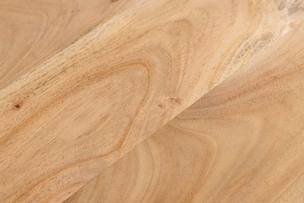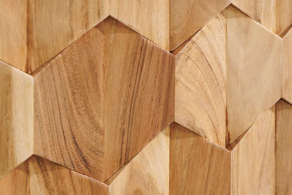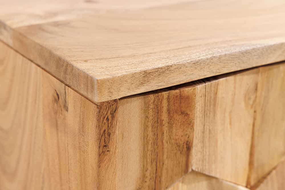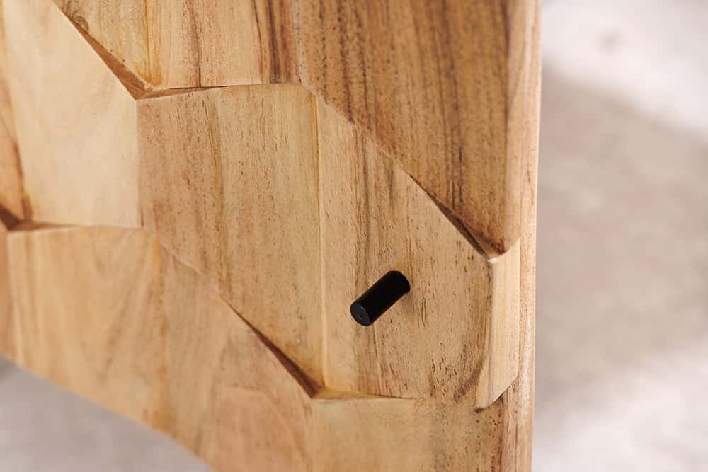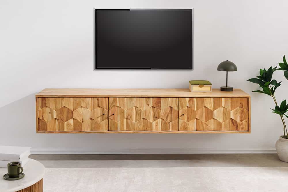 Modern strak vormgegeven zwevend TV meubel met drie deuren van massief acaciahout. Bijzonder indrukwekkend is de handgemaakte voorkant met een driedimensionaal mozaïekpatroon, dat dankzij de driedimensionale structuur een fascinerend spel van licht en schaduw creëert – een echt statement voor stijlvol leven. De hangende constructie geeft het meubel een zwevende functie en zorgt voor een modern en ruimtelijke sfeer.