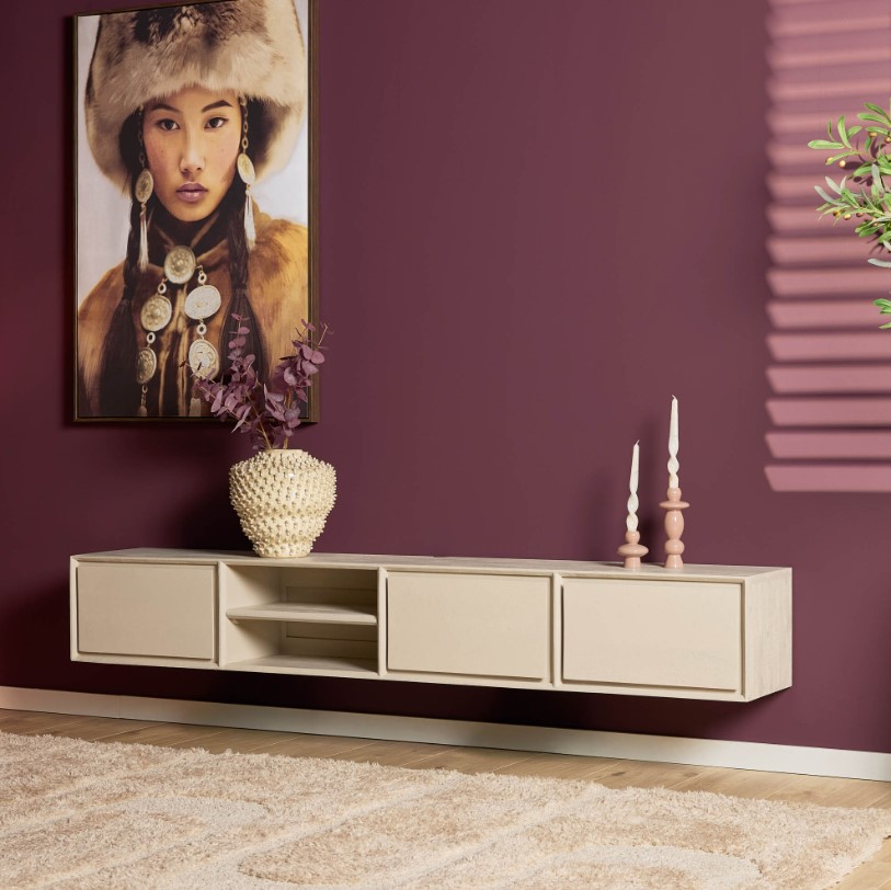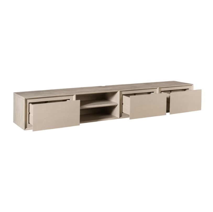 Stijlvol zwevend tv-meubel beigezand, gemaakt van massief mangohout. Het zwevende ontwerp schept een gevoel van ruimte in de woonkamer, waardoor een luchtige en open sfeer ontstaat. Dit tv-meubel is voorzien van twee open vakken en drie greep loze lades.
