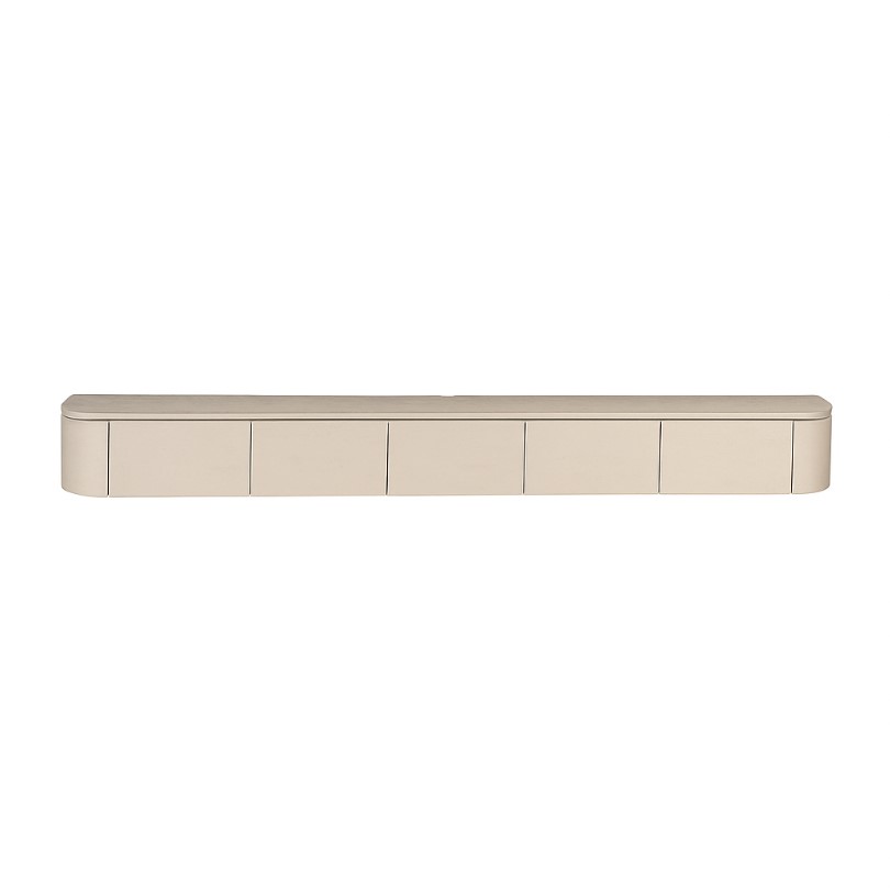 Modern zwevend greeploos tv meubel met rond vormgegeven hoeken en kabelopening in het bovenpaneel. Het meubel is gemaakt van massief mangohout en voorzien van vijf kleppen met hoogwaardige telescoop sluitsystemen. Bij dit meubel worden ook pootjes meegeleverd om er een staand model van te maken.