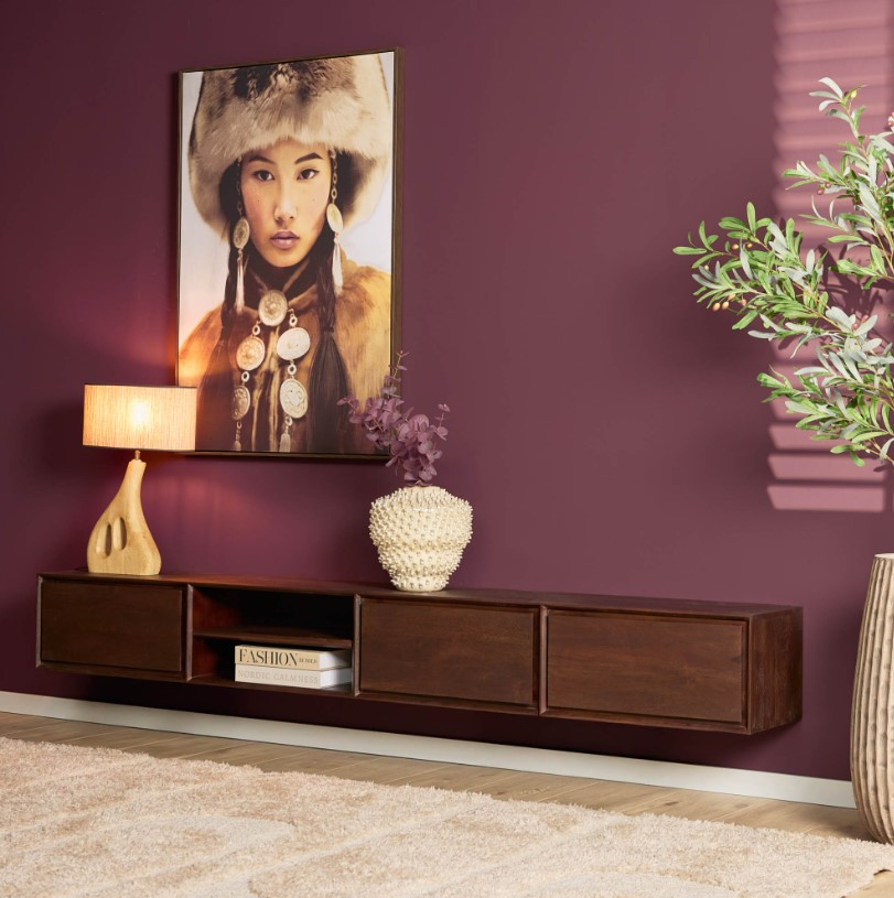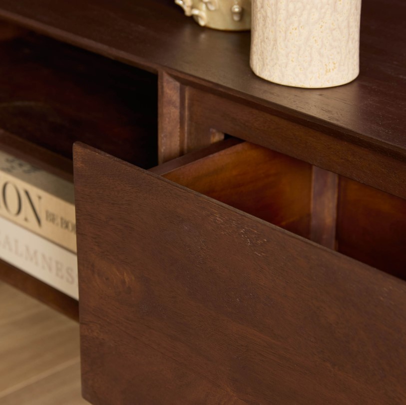 Strak modern zwevend tv-meubel donkerbruin, gemaakt van massief mangohout. Het zwevende ontwerp schept een gevoel van ruimte in de woonkamer, waardoor een luchtige en open sfeer ontstaat. Dit tv-meubel is voorzien van twee open vakken en drie greeploze lades. Het bovenblad is voorzien van een kabelopening.
