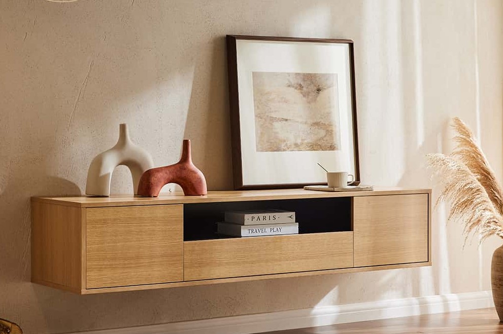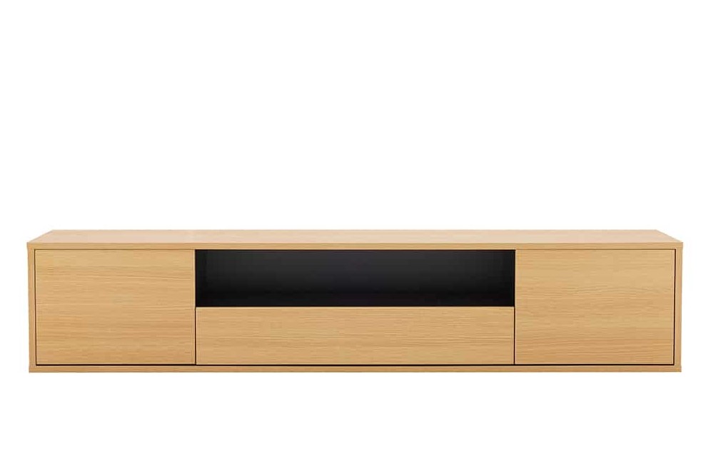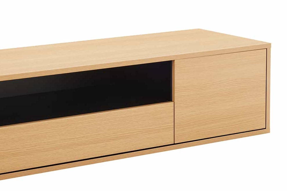 Dit hangende TV-meubel combineert tijdloos ontwerp met doordachte functionaliteit. De combinatie van een kastombouw in eiken kleur en elegante accenten in zwart zorgt voor een moderne kleurcombinatie. De zwevende wandbevestiging zorgt ervoor dat het meubelstuk elegant oogt.